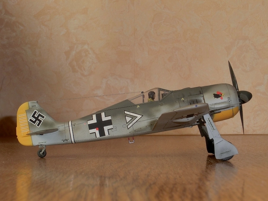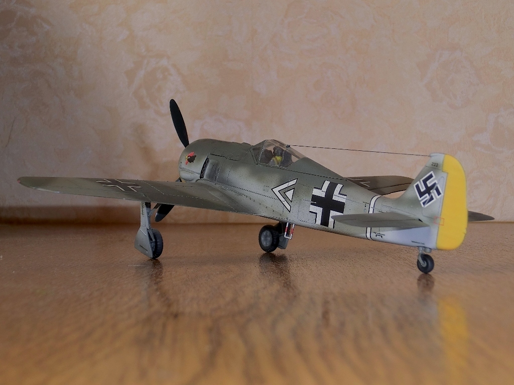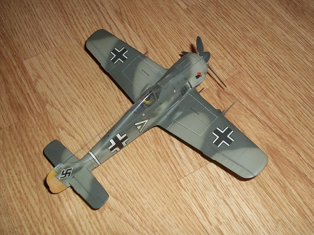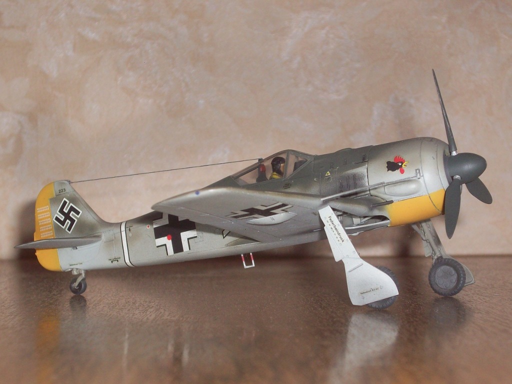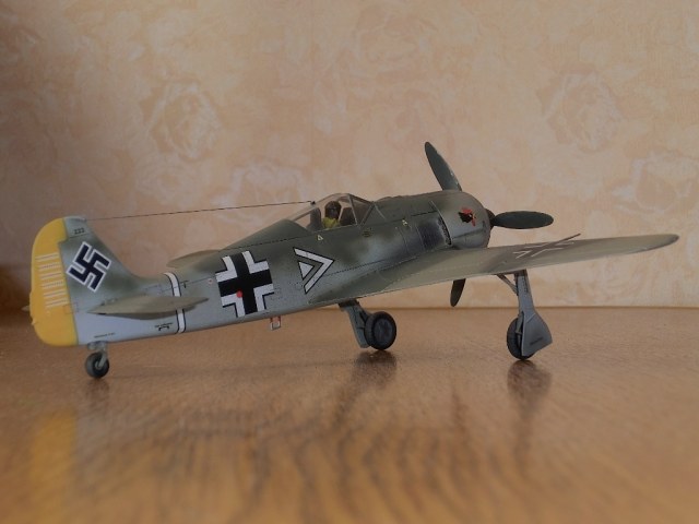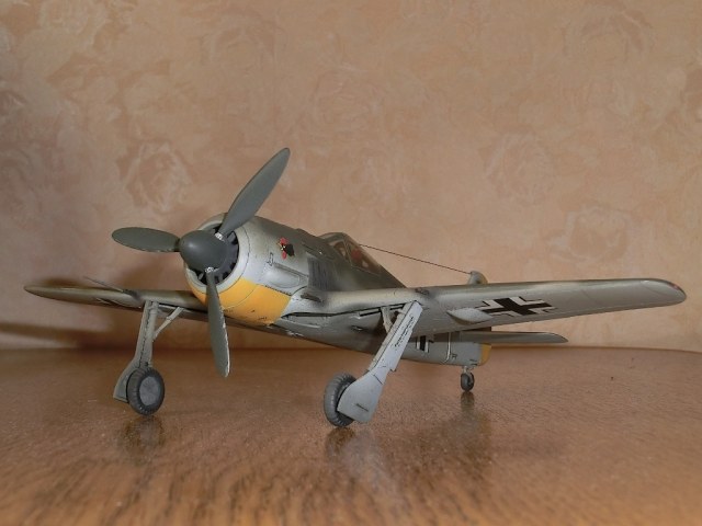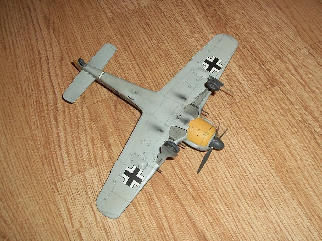 Винт должен быть RLM70, диски могли быть RLM02 или черные, никакого нагара от пороховых газов не должно быть и в помине, на модели отсутствует трос натяжения антенны за бронезаголовником и тяга уборки хвостового колеса на правой стойке. И еще под большим сомнением наличие внешних крыльевых пулеметов.