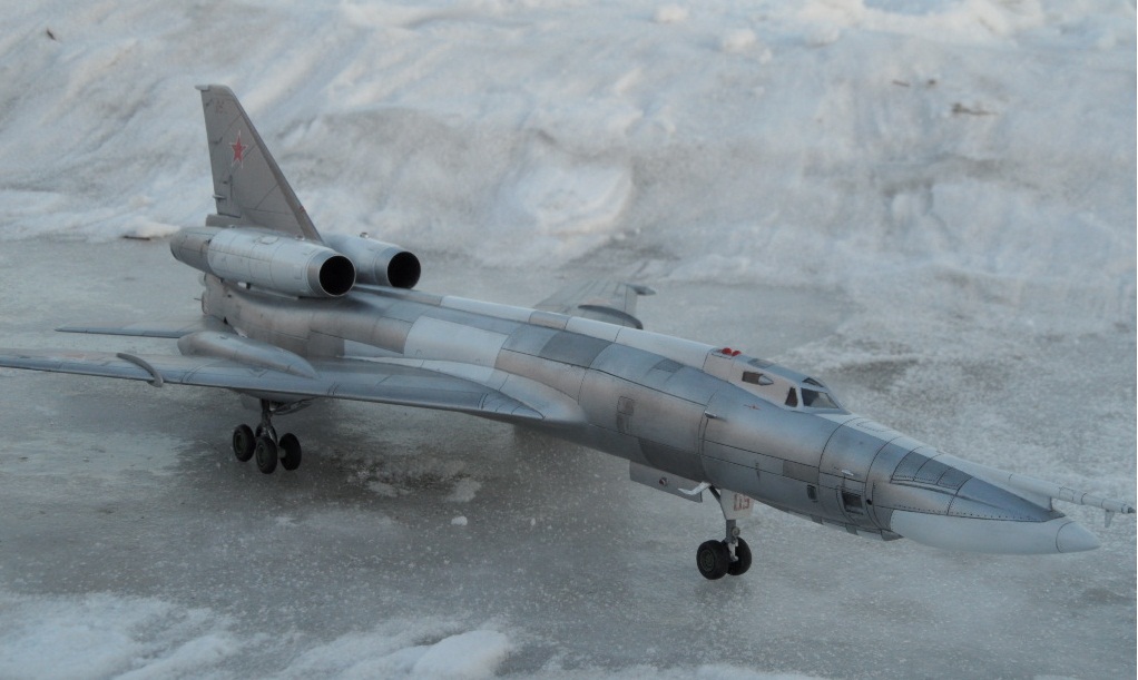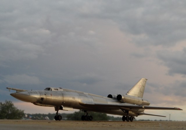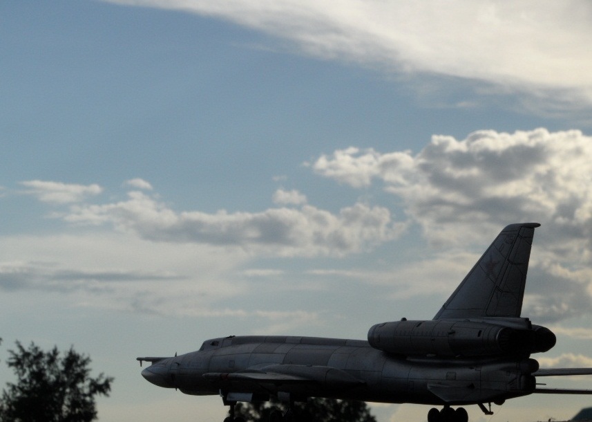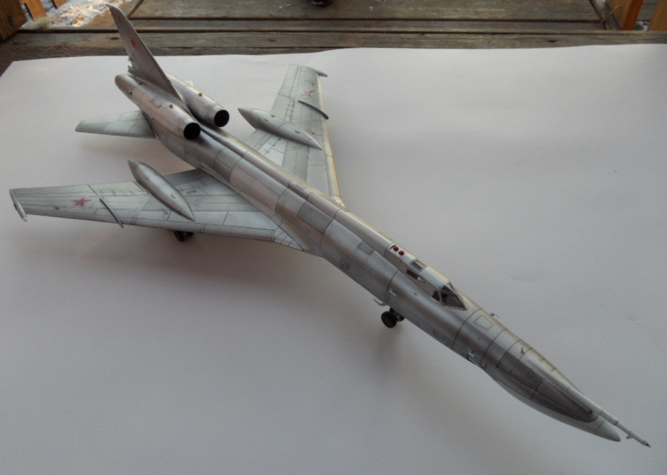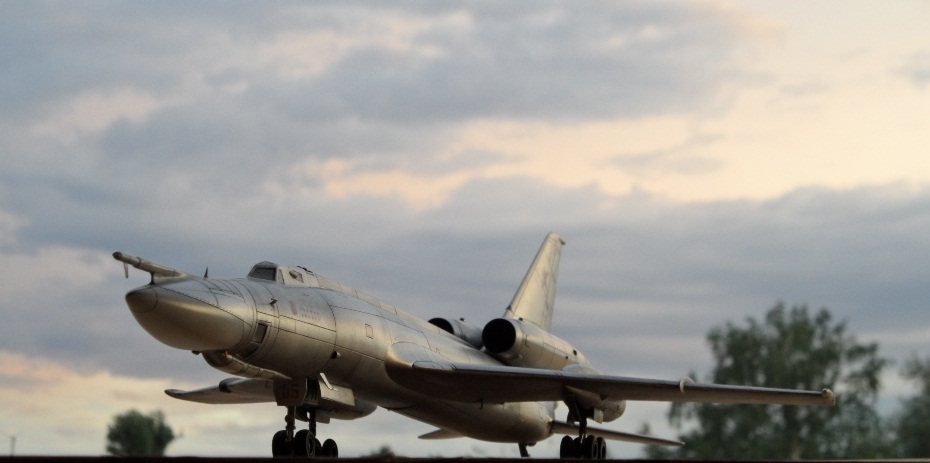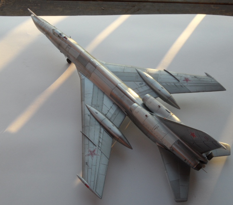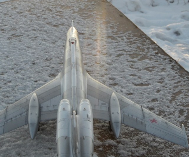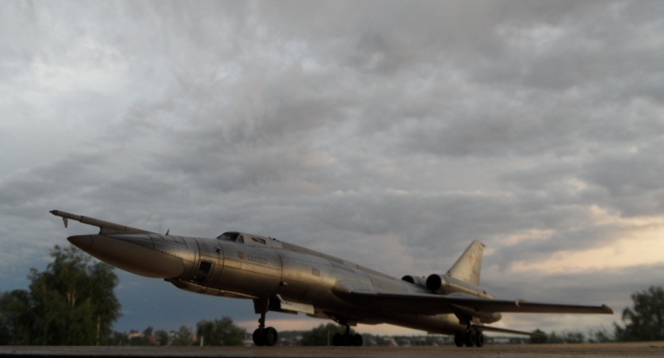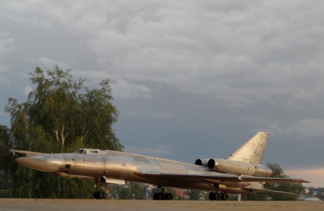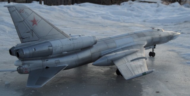 Всем привет, почитав отзывы о своем ту 22, а написано там было что нужно модель оживить, кое что доделать я принял решение - ПЕРЕДЕЛАТЬ. Если честно то модель от итала только издалека похожа на ту 22, а так как собирал я его давно, когда еще только учился правильно красить, то и доработок там соответственно никаких небыло, а дорабатывать нужно все, удлинять фюзеляж , переделывать нос, колеса, стойки шасси итд. Так как модель у меня уже собрана я не решился на глобальный распил, честно побоялся испортить, а модель такую уже и не купить- сняли с производства. В общем краску сошкурил, оторвал мотогондолы- это самый явный косяк, на самолете они расположены гораздо ближе чем на модели итала да и вообще не так, переделал мотогондолы, прорезал недостоющую расшивку,укоротил стойки , маленько переделал , сам сделал штангу дозаправки, добавил антенны , воздухозаборники, заменил остекления кабины штурмана на пленку, прорезал окно для астрокомпаса, сделал приемники на гаргроте, зеркала заднего обзора для оперетора, переделал стабилизаторы под нужный угол, колес от Экипажа нет пока в магазине где я закупаюсь, ну ничего через 2 недельки подвезут, поэтому стоят родные на задних тележках и переточенные от су 24 на передней, добавил огни на мотогондолах, крыльях и передней створки шасси, декалей у меня небыло, поэтому тут все сборное от ту 160, ту 22м3. Окраска как всегда из баллончика + кисть. Переделывать всегда труднее чем делать из набора, конечно если счас с нуля делал бы всю механизацию бы сделал и удлиннил и много что еще, но так как модель уже была склеена то получилось что получилось. а вообще модель оч крупная- ту 128 рядом несмотрится истребителем переростком, обычный такой средненький истребок))) Большое спасибо " Дальнику" за помощь в сборе информации. Если кому интересно как ту выглядел перед переделкой я закинул одну фотку, ну и модель у меня на страничке есть, пока не буду удалять. ДОБАВИЛ пару фоток на солнце для сравнения размеров с миг 25, теперь видно насколько большой ту 22.