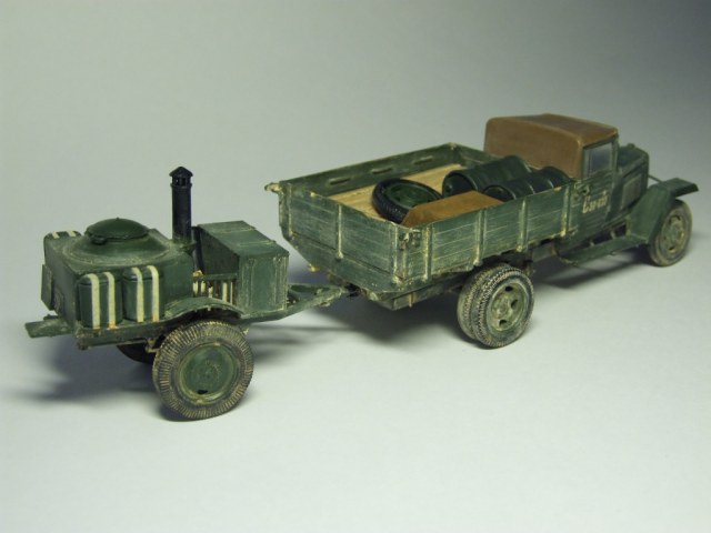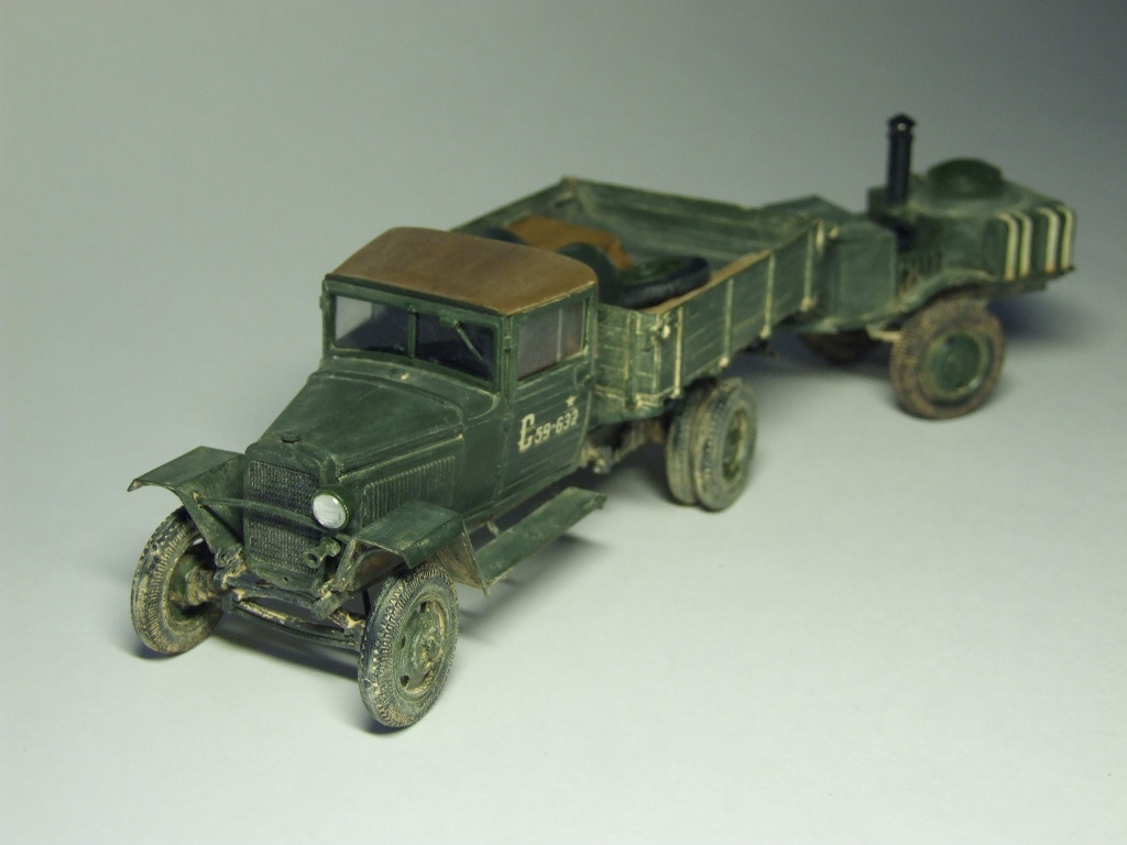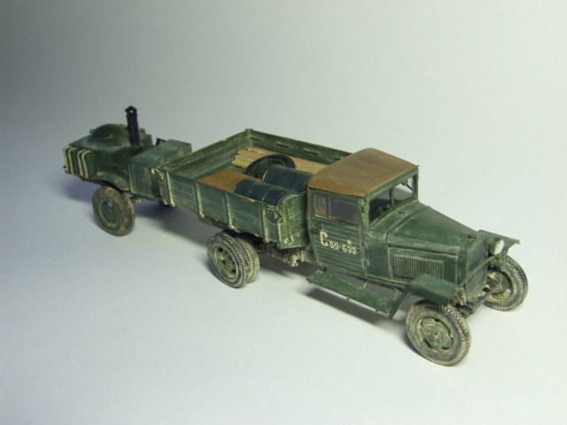 Представляю Вам всем известную полуторку с полевой кухней от Восточного Экспресса. Попытался немного поправить по матчасти (скорее ради тренировки) - редуктор заднего моста, тяги, убрал лишнюю деталь после КПП и передние тормоза, подточил крылья, расточил рамки дверных стекол, заменил сцепное устройство, добавил стойку лобового стекла (само стекло также самодельное), отражатель из фольги в фару.