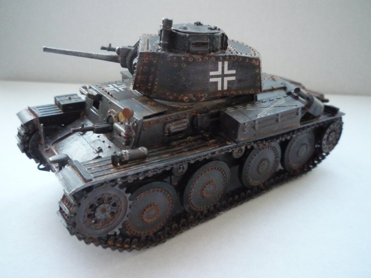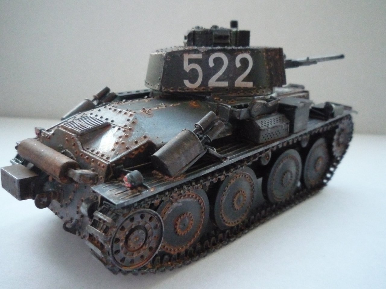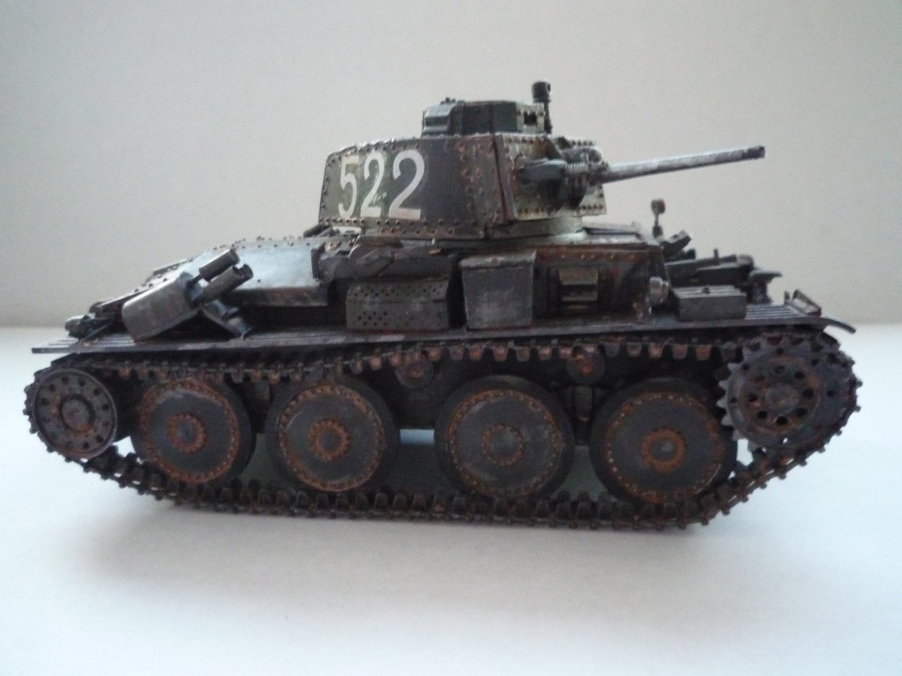 Не понял автора... Полгода назад собрал такого же "чеха'. У меня лично ушло около 3-х месяцев. Судя по некоторым деталям много времени потрачено и вами. Одни "гуси" чего стоят! И тут же в одном флаконе просто откровенная небрежность,- к примеру: необрезанные декали,крест сверху на корпусе и т.д... Впрочем, в целом танк смотрится. Если хотите - совет. Надоела модель, отложите в сторону на время.