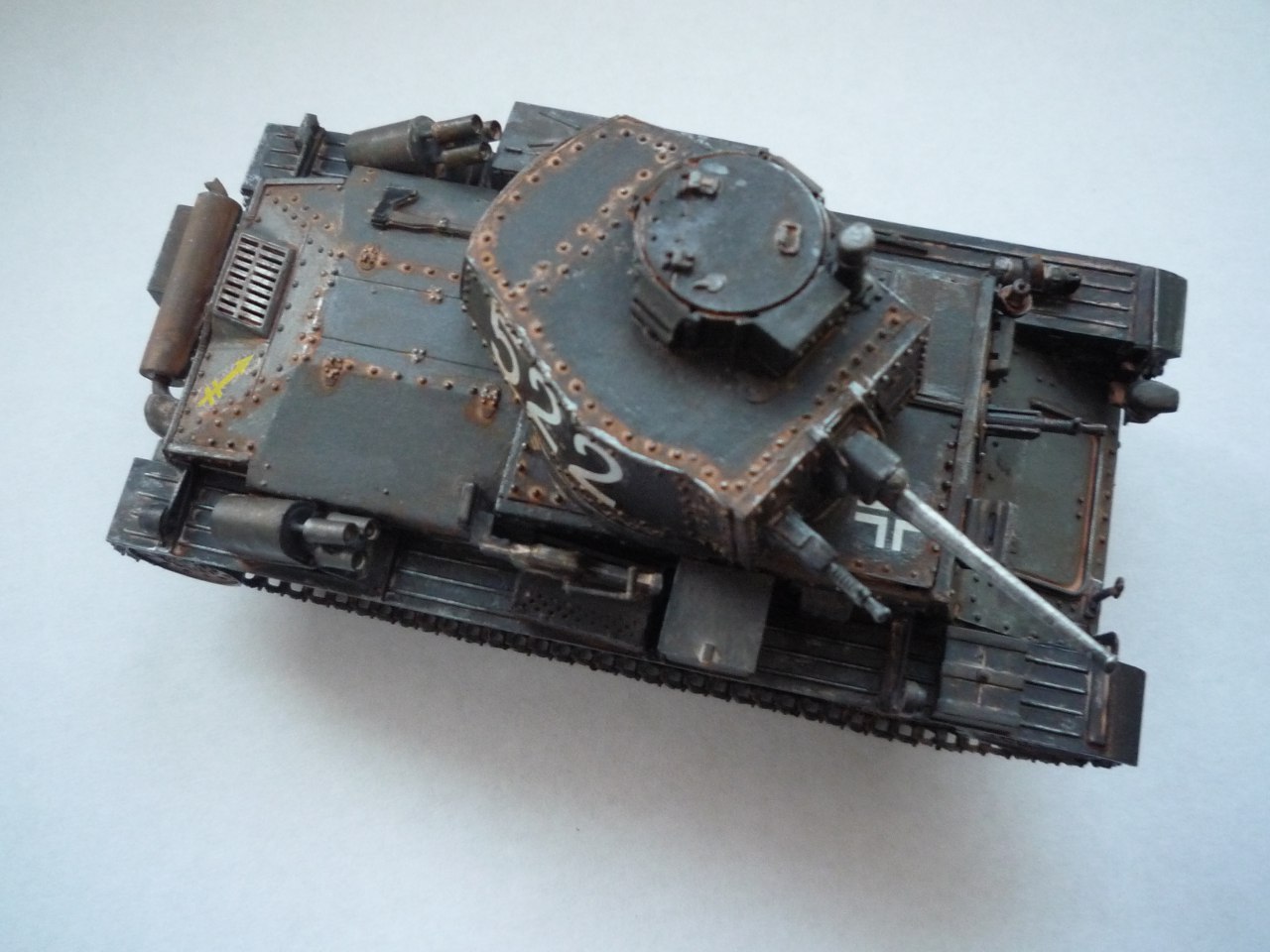 П.С. модель комплектовалась наборными траками модели "ужос". Намучался с ними- мелкие, кривые в облое. В итоге легли совсем не ровно. Стыковка деталей тоже была не на высоте. В силу своей неопытности просто забил на это. Пусть будет похож на восстановленый после взрыва боекомплекта и простоявший в поле, под осенними дождями месяц-другой) и использовавшийся какими-ть партизанами.