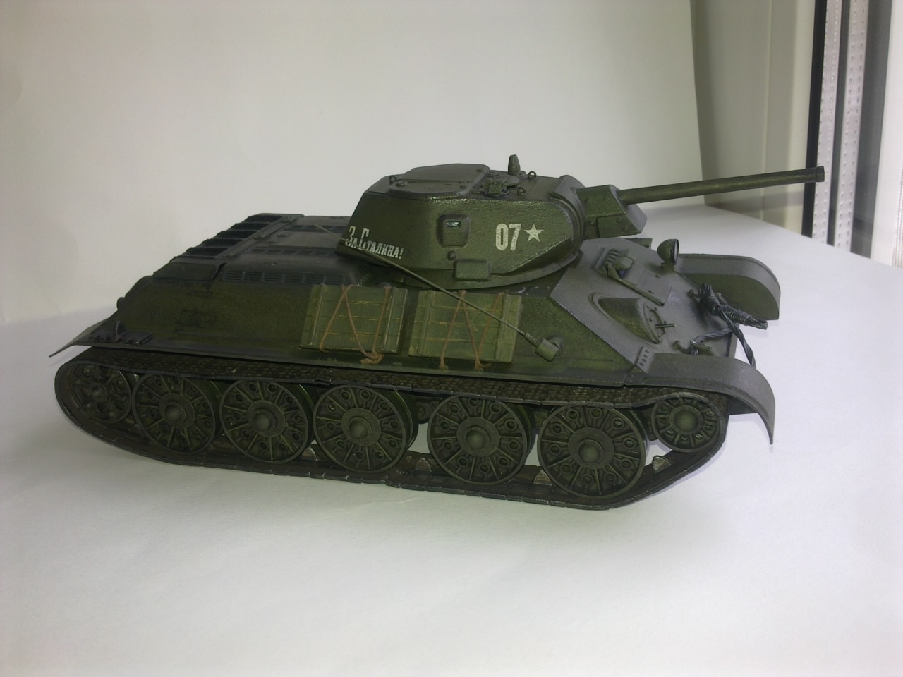 Здравстуйте, коллега! Почему так назвал-просто у меня сейчас в сборке точно такая-же модель! Ваша работа понравилась.Хотелось бы отметить серьезную предсборочную подготовку-Фара не сбоку, а на лобовом листе+,курсовой пулемет без маски+.Несколько небольших добавлений-ведь у Вас Сталинградский Т-34?Если так, то люк на кормовой плите должен быть не круглый, а прямоугольный,лобовая плита корпуса крепилась в шип (правда не на всех-я тоже упростил...).Ну я еще добавил запасные топливные баки (4 шт.) с двух сторон вдоль корпуса, крепежку и сами баклушки под домкрат по бокам ближе к корме. Ну ладно-это все не существенно и на любителей поконверсировать... А Вашей модели ставлю "5"! Дерзайте!