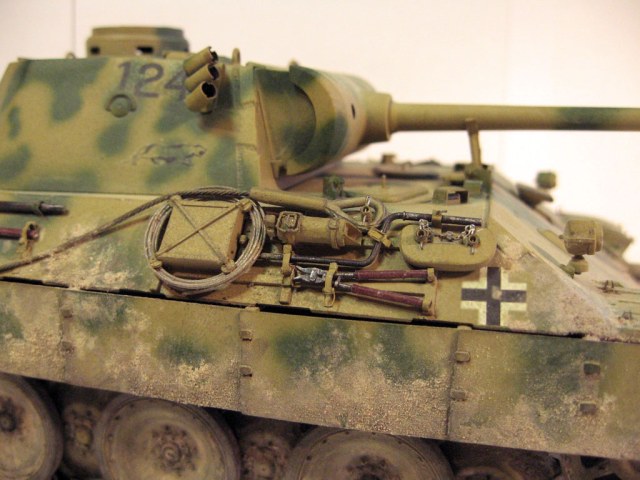 ...да, Вы правы. Красил "тамией", аэрографом. Тросы вил из лужёнки (брал три жилки). Из допов: средний зажим на кривой стартёр, они были только на Ausf. D - ранних выпусков. В чертежах и инструкции по монтажу этот зажим не указан. но уверенно просматривается на арх.фото. Грязь накладывал, на смоченным жидким акрилом - тертую пастель. Если есть какие вопросы, разумеется отвечу. А, так вроде и всё.