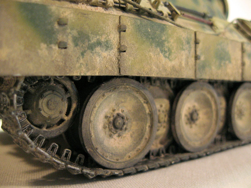 Отличная работа! И сборка, и покраска, и загрязнение очень понравились! Но, ИМХО, обода внутреннего ряда катков должны быть стерты до металла даже при загрязненной ходовой.