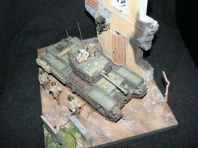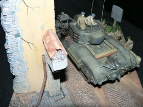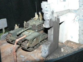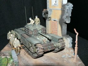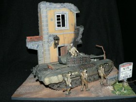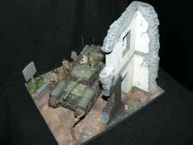Наконец-то нашлось время, чтобы выложить свое творение – диораму на тему Нормандии, назвав ее условно «На Кан». Развалины от MiniArt, сборка которых произвела приятное впечатление. От себя добавил отличный смоляной указатель «на Кан» от MK35, а также набросал каменных кирпичей, сделанных мной из алебастра. Центром диорамы является танк «Черчилль», о котором уже было рассказано вот тут http://www.karopka.ru/community/user/7191/?MODEL=177483. Фигурки солдат от Tamiya (весьма убогого качества), к ним сделал только ремни для винтовок. Окраска традиционно акрилами Tamiyaи Vallejo + пигменты MIG и кое-чего темперой. Вот собственно все.