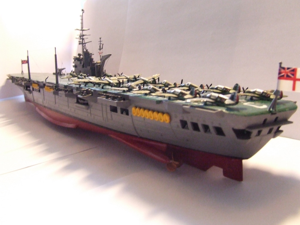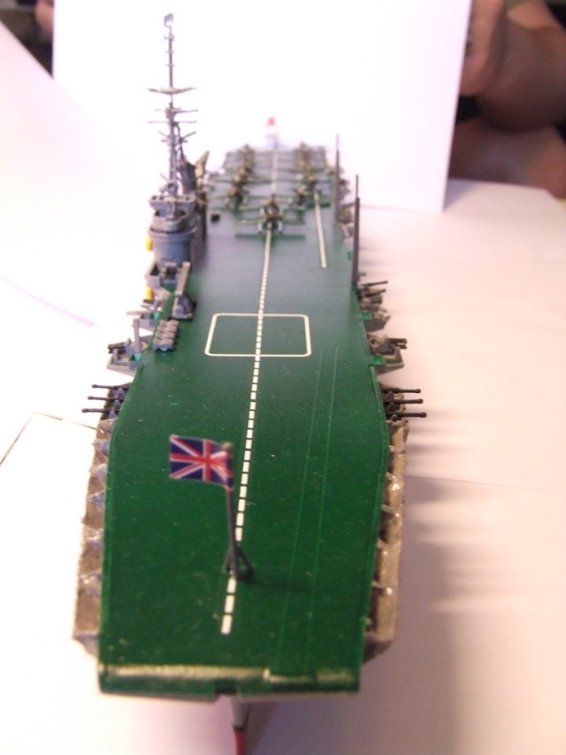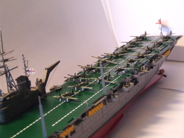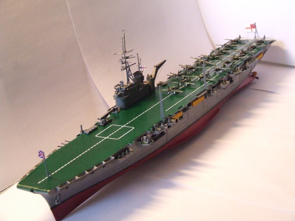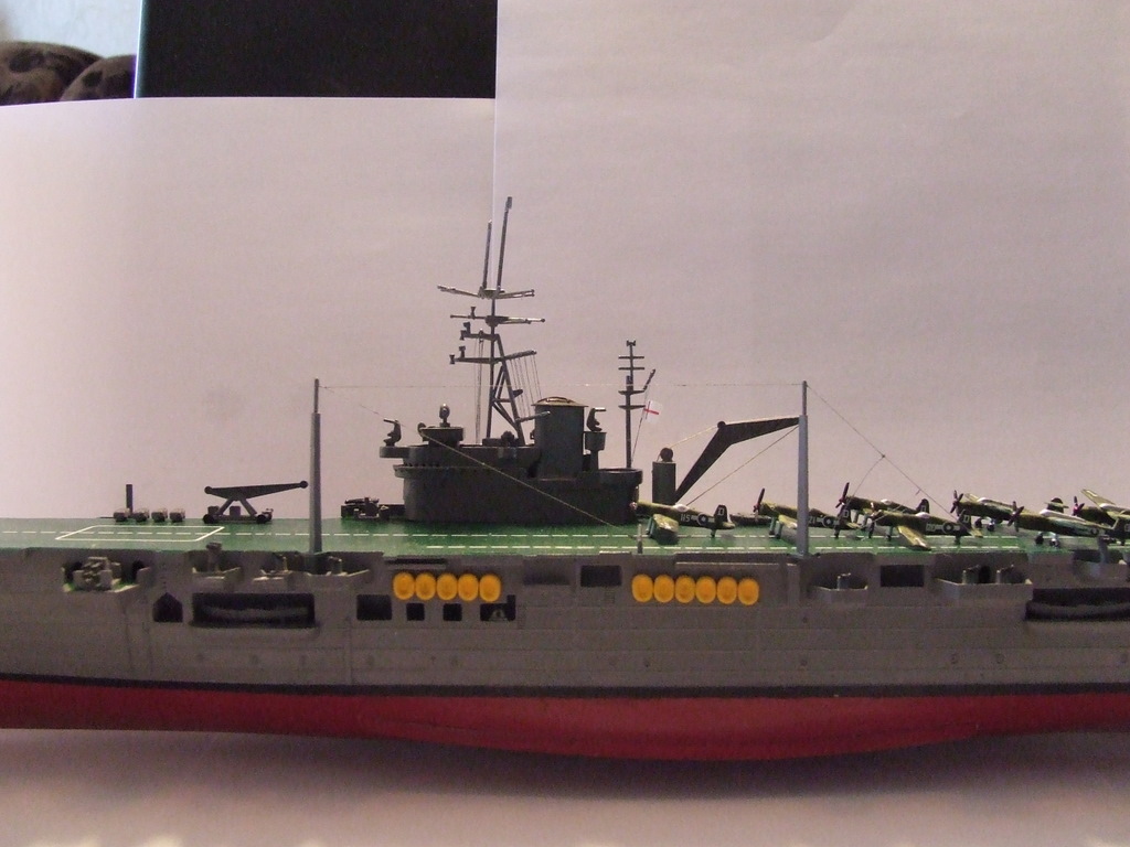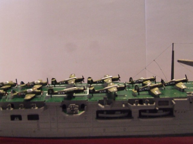 Вот и подошла моя вторая модель,качество литников оставляют желать лучшего,нестыкуемость деталей поразительная,нож и маникюрный напильник стали лучшими друзьями,без косяков тоже не обошлось,стык палубы и бортов,такелаж,и прочее но следующий раз испралюсь,окраска тоже не очень иногда перекрашивал по три раза,самалеты слегка достали из-за их количества но всетаки за 1,5 месяца справился,коробка от модели в два раза больше чем сам по этому выбрасывал с облегчением.Кстати масштаб 1-400 так,что судите строго ибо истина где-то рядом)))))