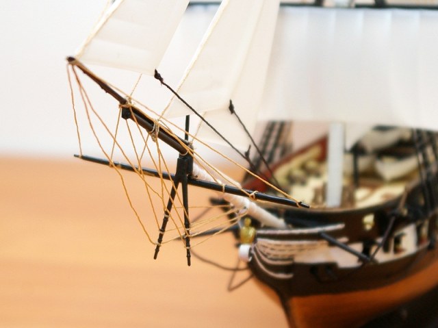 С выбором цветов нитей для такелажа есть промах. Бегучий такелаж должен быть одного цвета, обычно, - светло-коричневого (шкоты, фалы и т.д.), а стоячий - черного или темно-коричневого цвета (штаги,фордуны).
