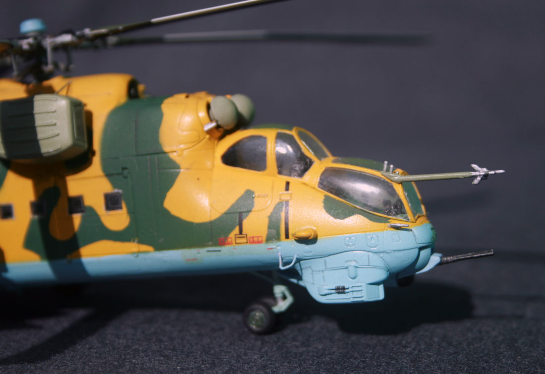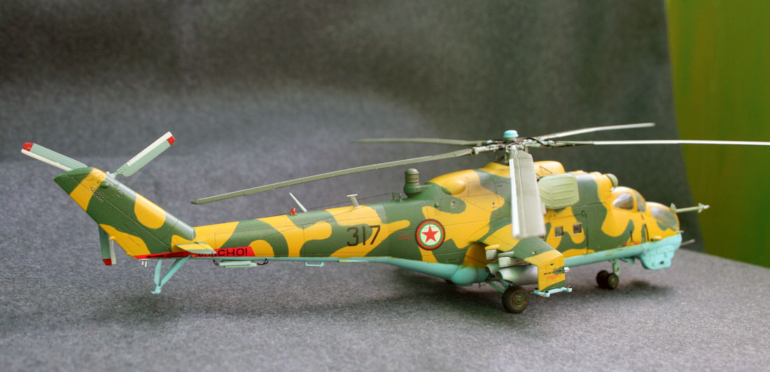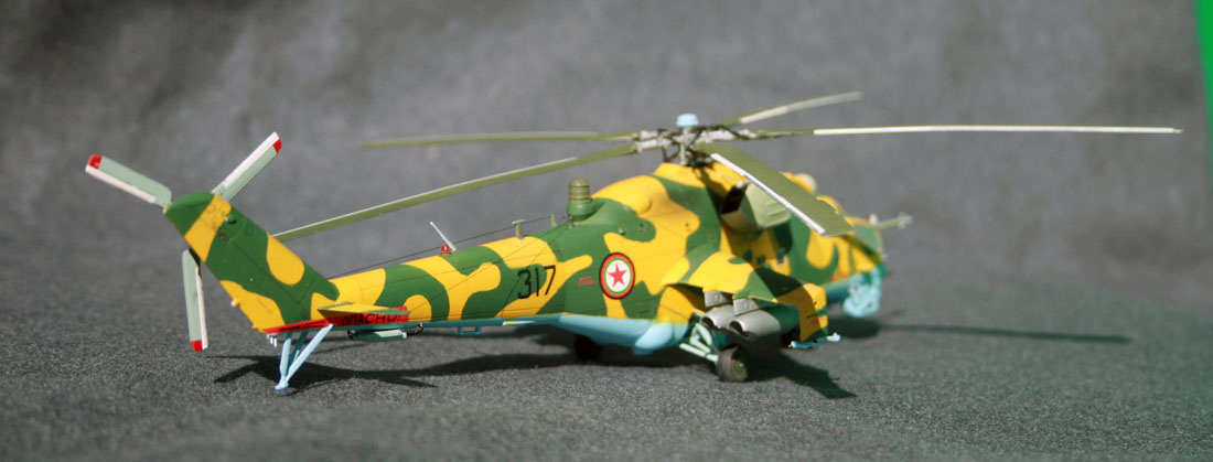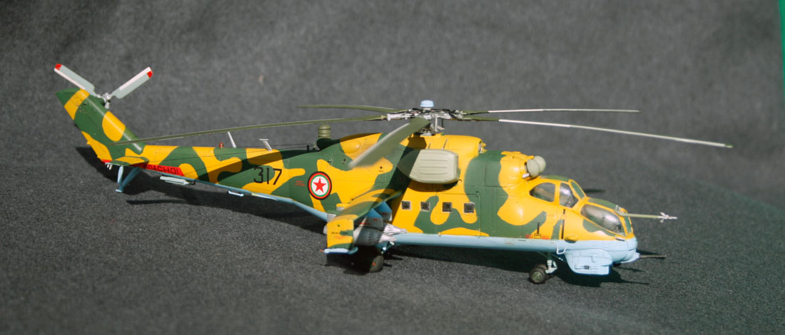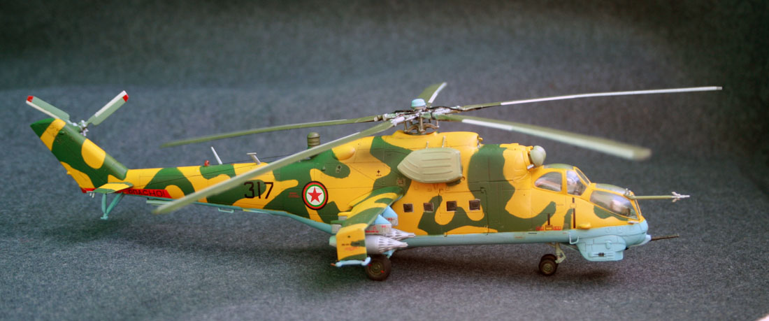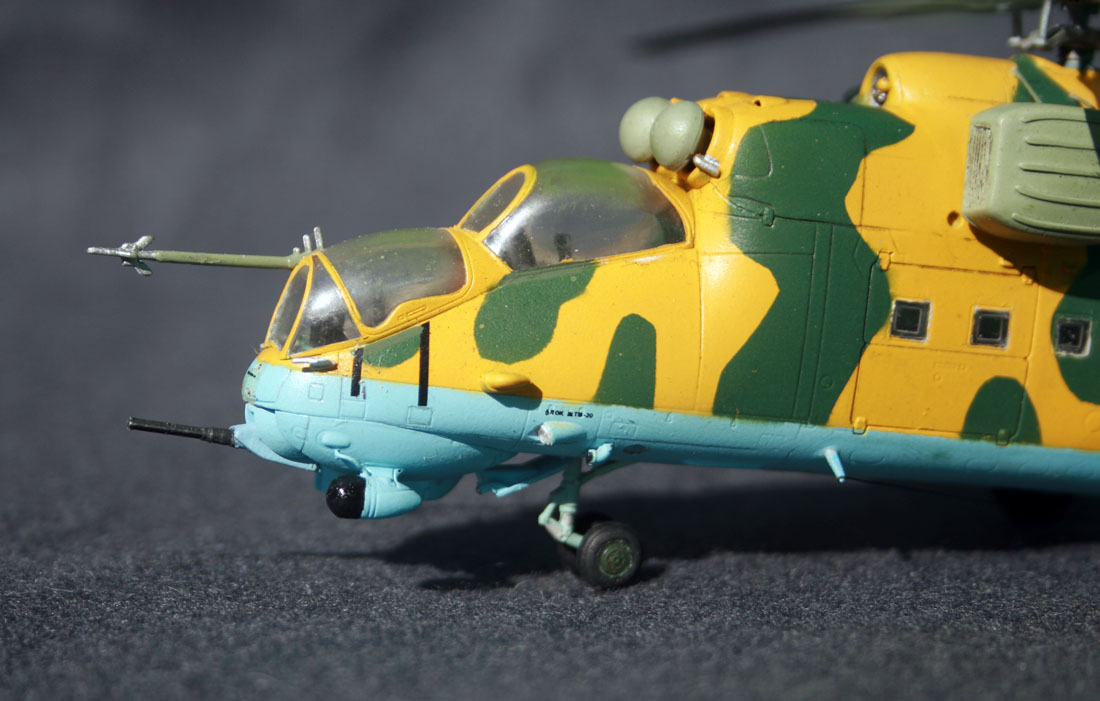 Здравствуйте коллеги, братья по диагнозу! Предлагаю вашему вниманию Ми-35 от ХоббиБоса. Когдо то были наполеоновские планы на эту модель, но после появления Ми-24 от Звезды стало не актуально. Модель собрана из каропки с минимальными доработками. ПВД,ЭВУ взяты от старой Звезды, АСО от новой. Блоки УБ-32 из арсенала, уж не помню от какой модели. Красил нитрухой, сверху полу матовый лак. Окрас соответствует экспортным машинам. Такие машины появились в Афгане в 1988г. Мазать и обдерать не стал, подразумевается, что машина новая. Только слегка выделил расшивку.