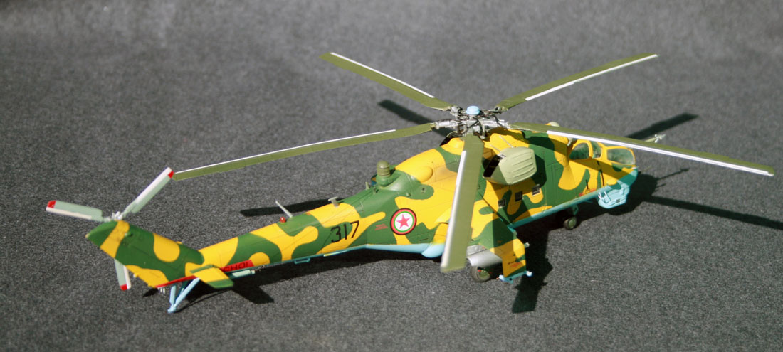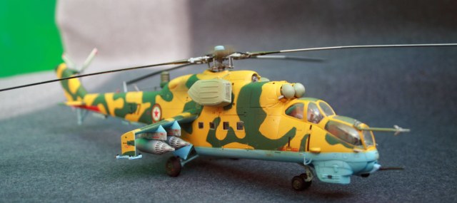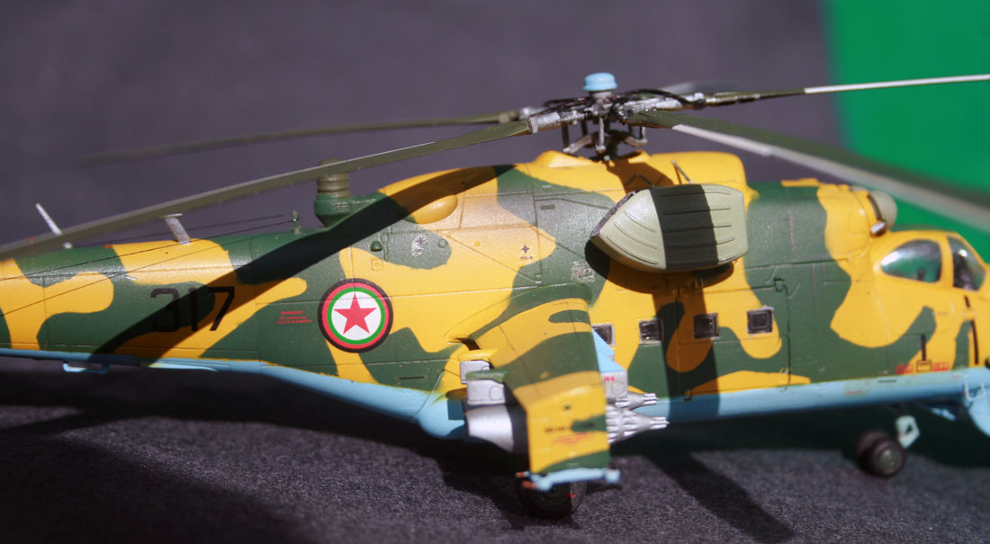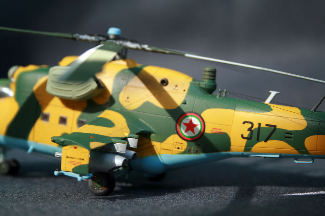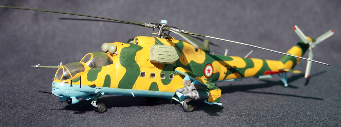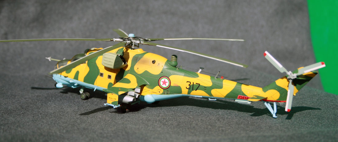 Здравствуйте коллеги, братья по диагнозу! Предлагаю вашему вниманию Ми-35 от ХоббиБоса. Когдо то были наполеоновские планы на эту модель, но после появления Ми-24 от Звезды стало не актуально. Модель собрана из каропки с минимальными доработками. ПВД,ЭВУ взяты от старой Звезды, АСО от новой. Блоки УБ-32 из арсенала, уж не помню от какой модели. Красил нитрухой, сверху полу матовый лак. Окрас соответствует экспортным машинам. Такие машины появились в Афгане в 1988г. Мазать и обдерать не стал, подразумевается, что машина новая. Только слегка выделил расшивку.
