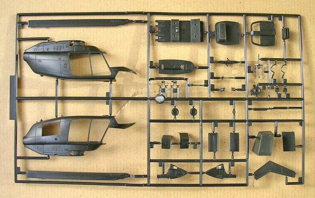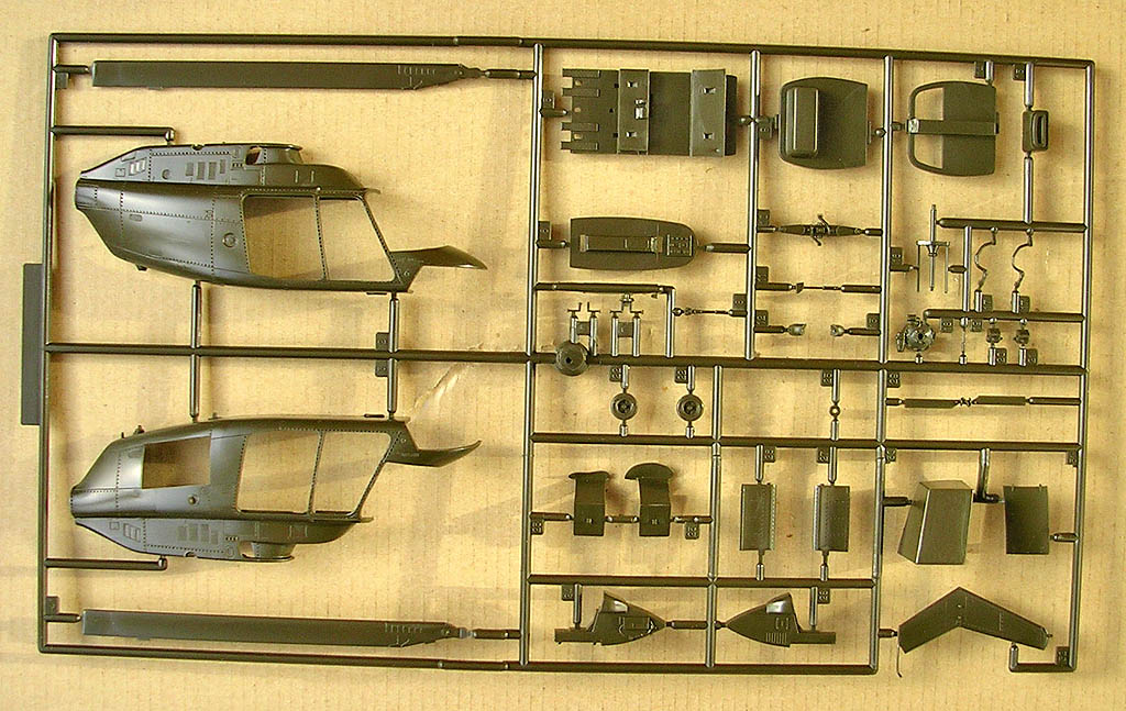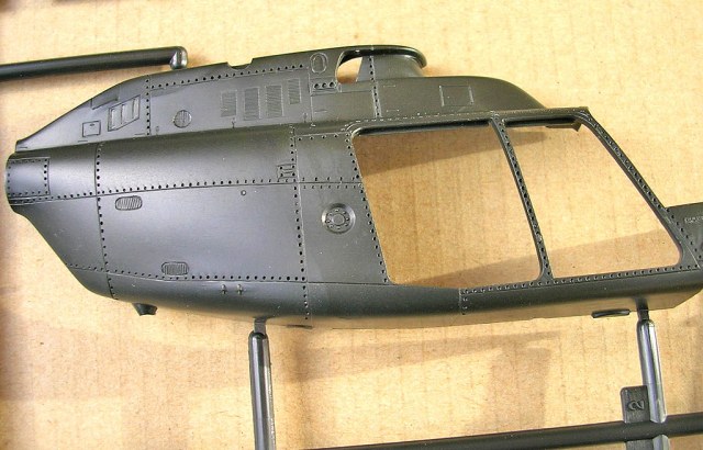 Первый литник у обеих моделей идентичен. Отличия во втором литнике, причем прессформа одна и та же, но видимо определенные участки перекрываются при отливке той или иной модели, тем самым получаются разные двери и салазки, а так же хвостовые балки которых есть два варианта. В модели джетрейнджера присутствуют оба, а у Кайовы только один из них - без обтекателя на конце и с открытым валом рулевого винта. У Джетрейнджера наоборот отсутствует вооружение. Деталировка хорошая, двери отлиты отдельно, что дает возможность сделать их в открытом положении, либо вообще открывающимися. Неплохо проработан салон, его можно доработать по множеству фотографии, которые легко можно найти в сети.