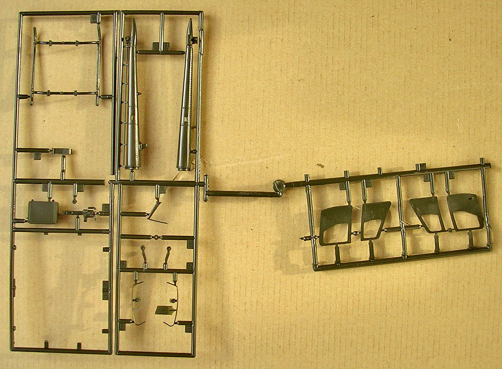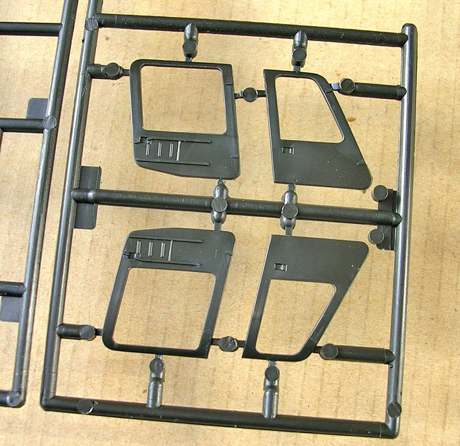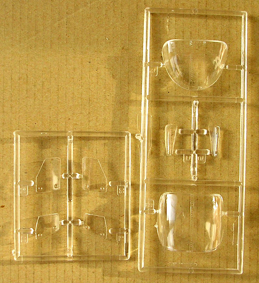 Литник с прозрачными деталями так же состоит из двух частей, одна из которых идентична у обоих моделей, на второй отлиты окна для дверей, отличающиеся формой и размером в разных наборах. Остекление вобщем очень хорошее, но имеет небольшие изъяны которые впрочем легко сошкурить и заполировать.