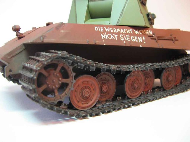 Занятный агрегат. Вцелом удался, смотрица весомо. Сколы несовсем... А коли они есть, то техника поездила, а коли поездила, то ходовку можно было еще поюзать. Добавить слегка подтеков, для колорита.