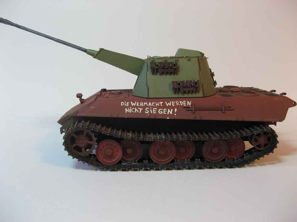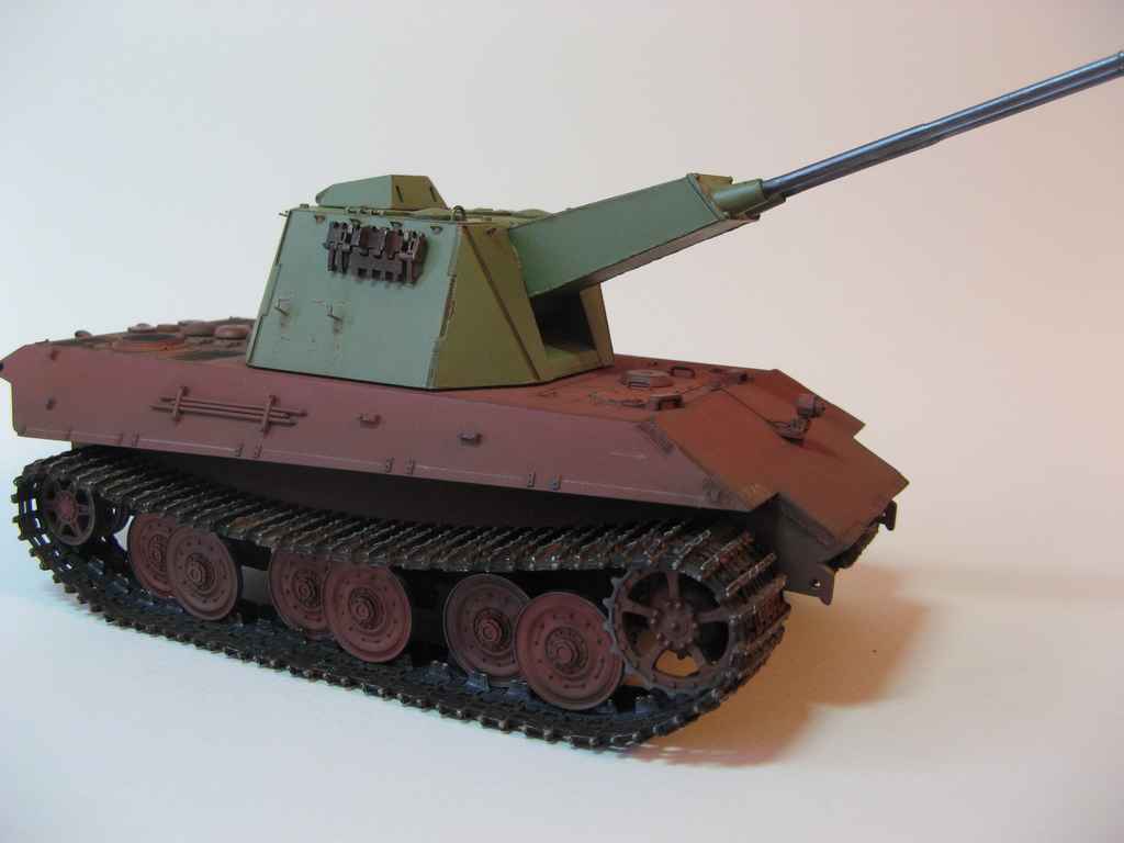Всем доброго времени суток,представляю вам свой очередной шушпанцер от трубача, сборка очень понравилась,задумывалась модель как прототип немного участвовавший в боях, собран полностью из коробки,немного доработал башенку, добавив скобы для запасных траков и ушки для маскировочных веток или сетки,траки фирмы фриул от совсем раннего кинг-тигра,красил тамией,тонировал маслом и миговскими пигментами.