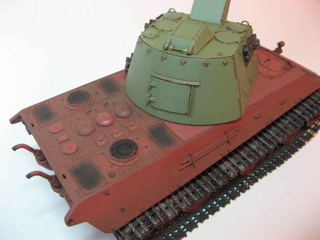 да он был и не на чертежах...но в боях участия так и не принял, он был готов как испытательная модель. Цвет корпуса я понимаю...а вот башни нет...согласно регламента, было два заводских цвета всего...коричнево красный и помоему серый...