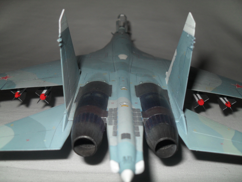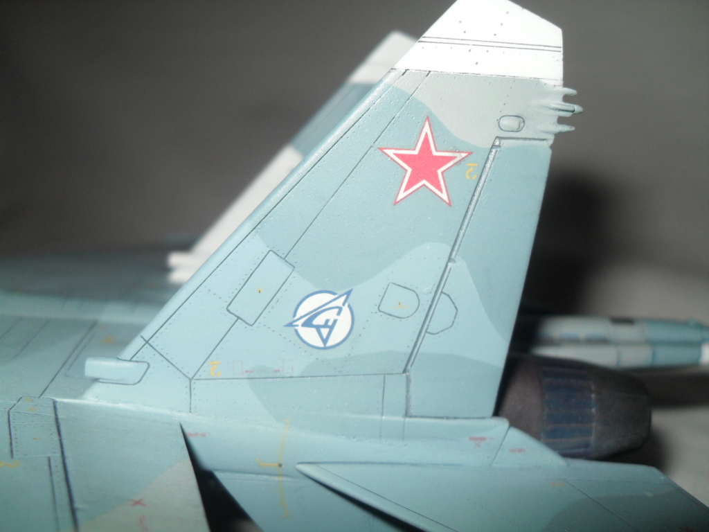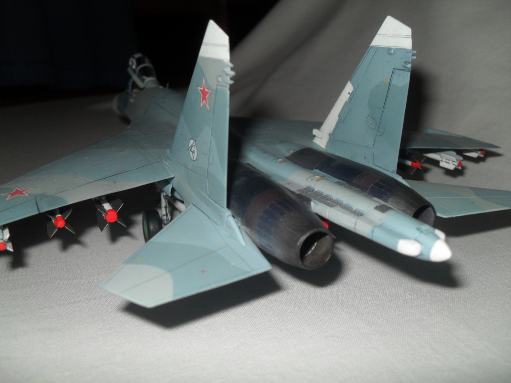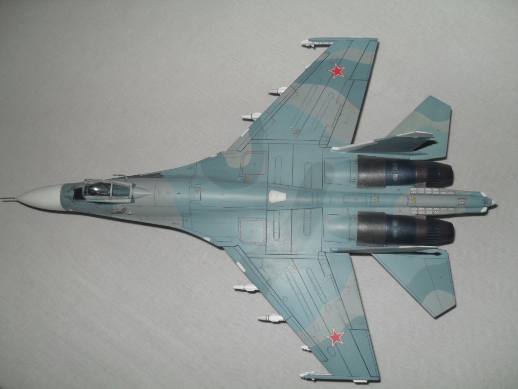 Что касается вашей модели - ШИКАРНО! Очень понравились стойки шасси, особенно прожектора на передней! Расшивка прекрасная! Я сам ещё делать не научился точно также как и на техничку терпения по определению не хватает. Замечательный результат! Не могу не задать пару вопросов. Вроде ж у 27-го сухаря 10 ракет - 4 под брюхом и по 3 на крыле. А у вас по 4 на крыле? Не ошибка ли Айсиэмовская? Вроде ж увеличенное, по сравнению с 27-ым, количество ракет шло уже на следующих модификациях - 30, 35 и т.д.? Или я чего-то не знаю? И ещё. Как делали шар оптико-локационной станции, тот, что перед фонарём? Очень понравился результат просто. Поделитесь секретом. Да, и ещё, металлическая полоска там же, это фольга??? Очень жду ответа.