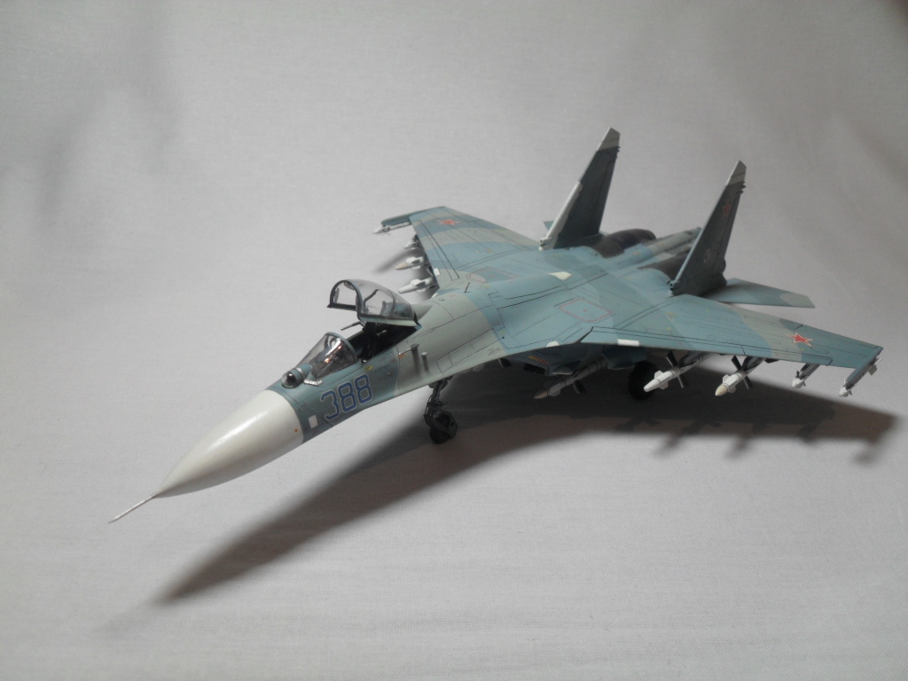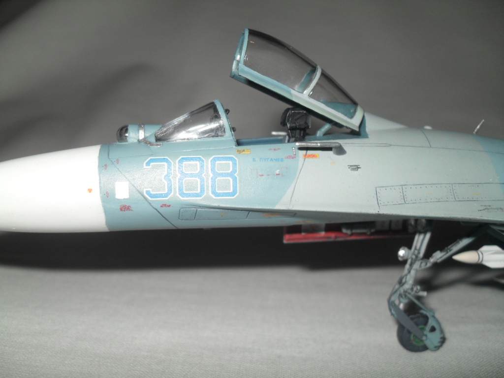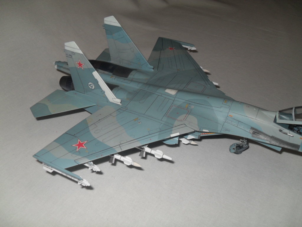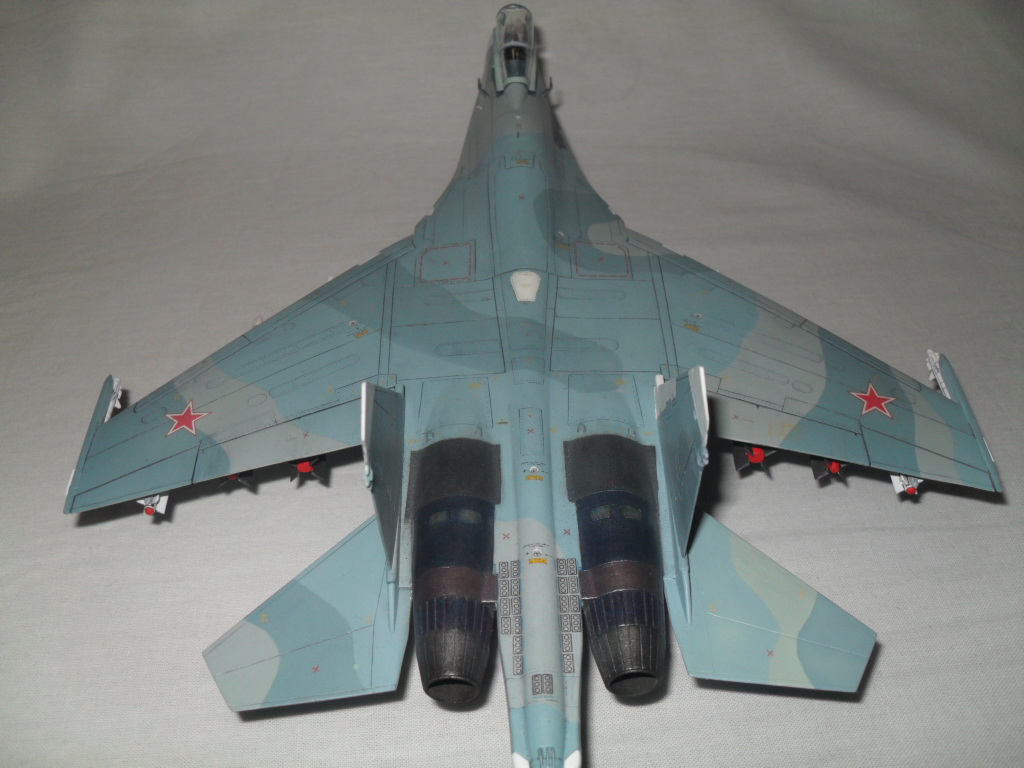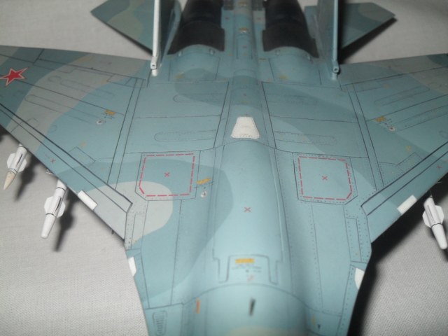 Что касается вашей модели - ШИКАРНО! Очень понравились стойки шасси, особенно прожектора на передней! Расшивка прекрасная! Я сам ещё делать не научился точно также как и на техничку терпения по определению не хватает. Замечательный результат! Не могу не задать пару вопросов. Вроде ж у 27-го сухаря 10 ракет - 4 под брюхом и по 3 на крыле. А у вас по 4 на крыле? Не ошибка ли Айсиэмовская? Вроде ж увеличенное, по сравнению с 27-ым, количество ракет шло уже на следующих модификациях - 30, 35 и т.д.? Или я чего-то не знаю? И ещё. Как делали шар оптико-локационной станции, тот, что перед фонарём? Очень понравился результат просто. Поделитесь секретом. Да, и ещё, металлическая полоска там же, это фольга??? Очень жду ответа.