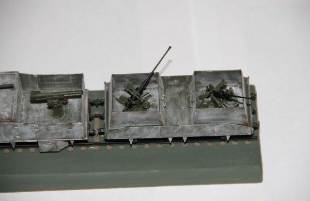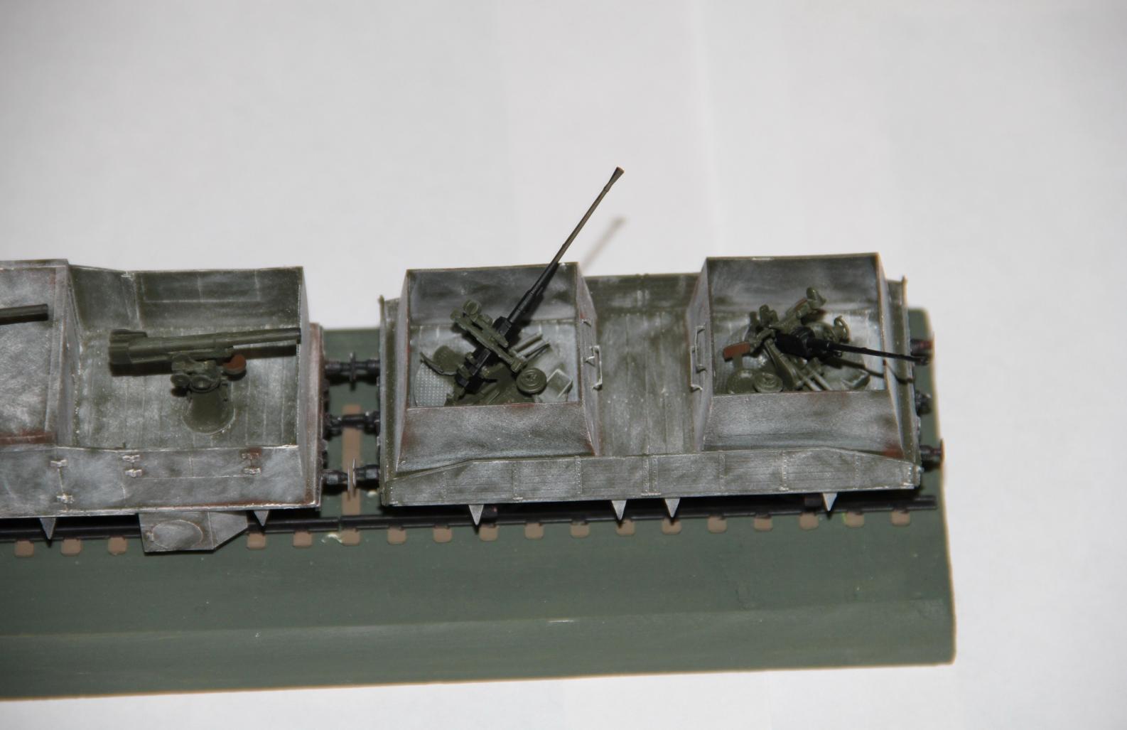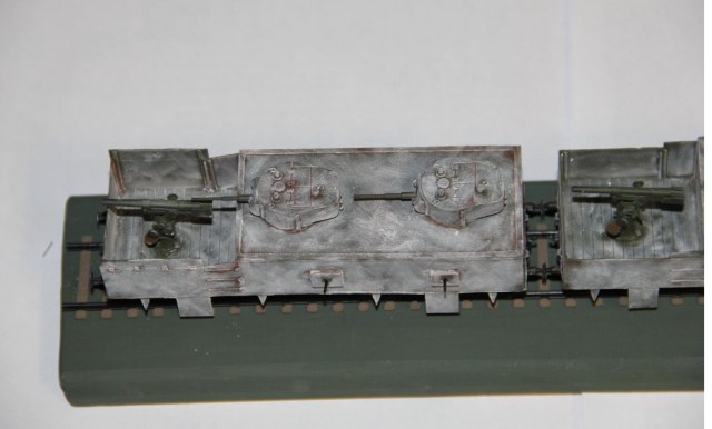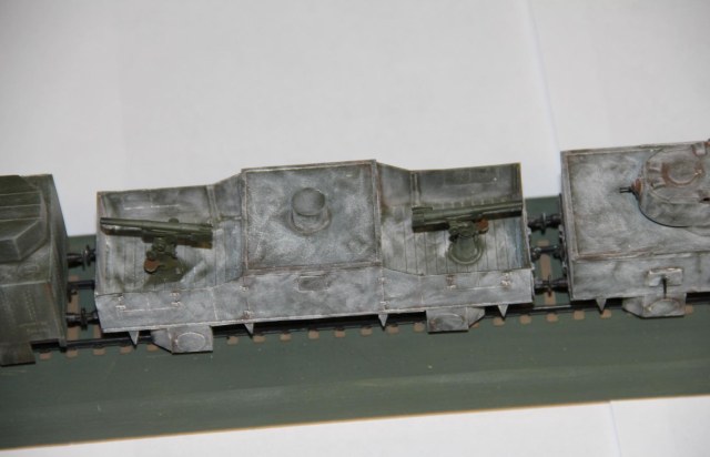 Одно НО:у всех бронепоездов спереди и сзади были прицеплены по две двухосных платформы.Во первых они защищали от подрыва фугаса заложенного под рельсами.Во вторых на них возили рельсы,шпалы для мелкого ремонта поврежденных путей.Без них как то пустовато смотрится.
