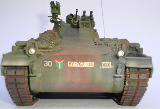 От себя добавил триплексы и антены. Красил как обычно акрилом от той-же Тамии, но вот фильтры, тонировка делались с помощью аэрографа. Добавил пигментов на катки. Образ - этакий трудяга на учениях.