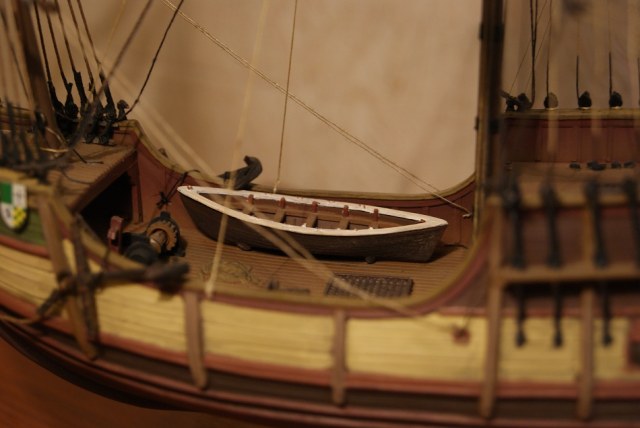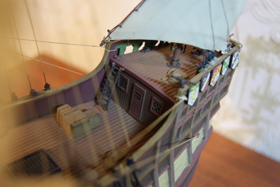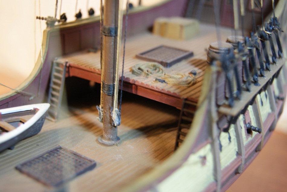 В целом, работа оставляет очень приятные впечатления. Очень понравилось большое кол-во бегущего и стоячего такелажа. По техническим аспектам напишет Marco Polo. Со своей стороны отмечу не совсем аккуратную покраску, кое-где имеются легкие непрокрасы. Сомневаюсь, что палуба была такой темной. Из явных косяков: приклеенные прямо к палубе (на баке) элементы такелажа - по-любому надо было изготовить утки либо киповую планку(не знаю что там должно быть).