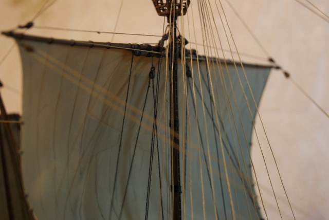 Модель длительное время стояла на полке и совсем недавно после очередного купания соскочила с подставки. В результате чего сорвалась грот- мачта. Окраска, паруса, детали и такелаж не пострадали. Однако ванты на грот-мачте восстановить не удалось. Грешен, я поленился вязать новые и нятянул обычные канатики. Немного правда не попал в нятяг. Я помню, что данный вариант предлагает производитель в инструкции к модели.