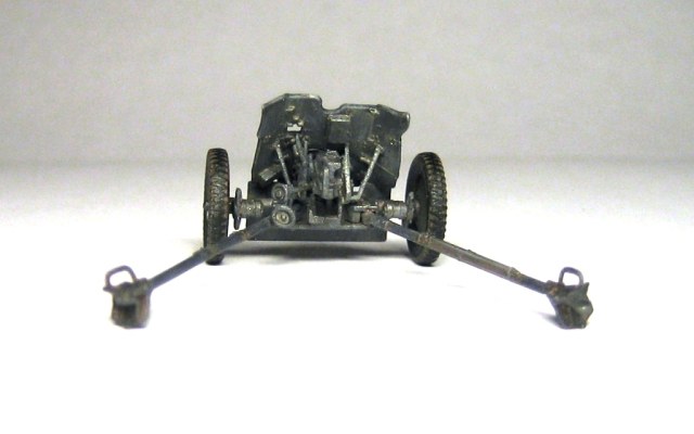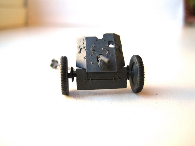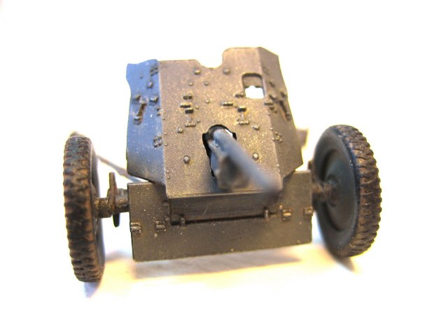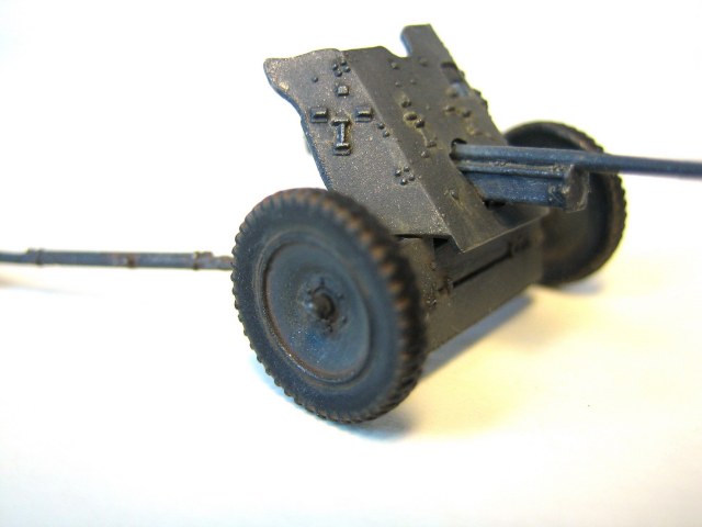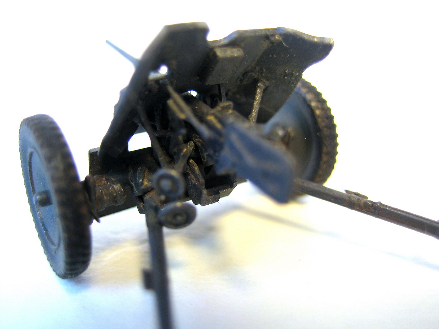 В матчасть особо не вдавался, но пришлось раздобыть с десяток фотографий реальных прототипов, ибо пользуясь приложенной инструкцией, легко можно перепутать детали местами и расположением, либо не понять вообще, что куда клеить. В процессе сборки был утерян какой-то ящичек, который должен быть закреплен на внутренней стороне щита. Пришлось выточить самому. Из доработок только высверленный ствол. Покраска – эмаль Тамия; смывка – акрил Тамия; матовый лак Тамия. Сама по себе одинокая пушка особого интереса не представляет, в будущем планирую приспособить ее на какую-нибудь диорамку (когда доросту до этого). По этой же причине не стал сильно пачкать ее и делать какую-либо подставку.