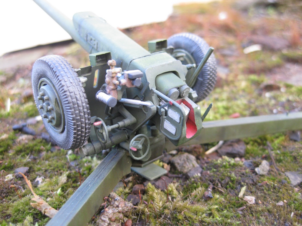 Стояла у нас в институте в одном из кабинетов такая штука, а увидев в магазине решил купить, на память. Собирал практически без доработок, из коробки, добавив только технические лючки. Это моя первая работа с моделями не от "Звезды", но качество модели оказалось чуть ли не хуже: пластик хрупкий (сломал две детали при обработке, при этом сильно не давил), очень много утяжин, не видимых с первого взгляда, что не удобно, т.к. детали довольно мелкие. Но мне очень понравились колёса! Есть некоторые косяки по сборке (места стыков на пушке выползли после покраски, хотя зачищал).