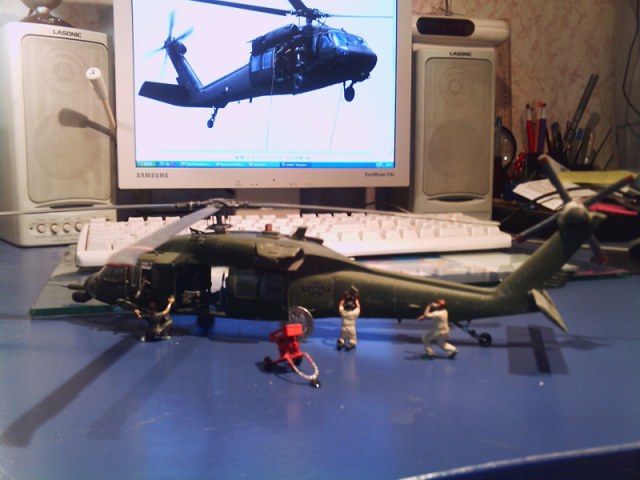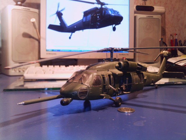 Выставлю на Вас судфотки 3 летней давности одной из моих работ. Вертолет «Дяди Сема» UH-60. (наверное Академи - точно не помню) масштаб 1:48. Собрал я где-то в 1999-2000гг. Красил кистью, краска Тамии. Тогда у меня было 2 маленьких электромоторчика от касетного магнитола. 1 моторчик вида как 10 рублевой манетки я склеил как основный двигатель, а второй маленький как таблетка в хвосте. Сами видите, когда они работают…. То неплохо смотрится.