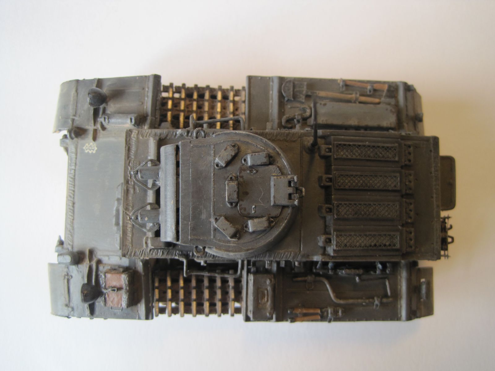 В сборке модель особых трудностей не доставила. От фототравления ощущение двоякое: в результате модель становится зрелищнее, но сборка мелких деталей, особенно всяких петель и замочков - это ужас! Плюс пришлось точить надгусеничные полки, так как фототравленные грязезащитные щитки оказались чуть уже (примерно на 1 мм). Также был утерян уже собранный с травленными креплениями огнетушитель и пришлось ставить огнетушитель с доисторической звездовской "четверки". Не все получилось как хотелось бы (например петли грязезащитных щитков, задний походный фонарь), но получен довольно ценный для меня опыт.
