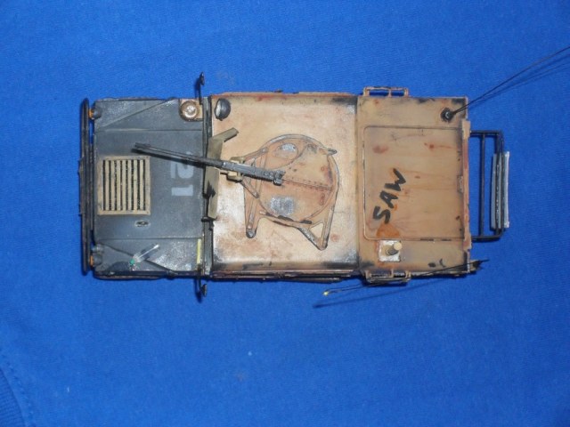 Вообще данный борт(21) не имеет никакой исторической привязки.Он является собирательным образом,для передачи самой атмосферы.Доработки в основом делал по мелочам:доработал детали салона(проводка,сидения,обшивка,дуги безопасности и систему связи со всеми блоками антенн),сделал сами антенны,добавил коробочки от REALMODEL,сделал поручни,напольное покрытие,утопил крепления колеса,кондиционер,торпедо,нацепил ювелирные цепи,смастерил дополнительную броню на двери и пулеметное место по фото(см в конце),фонарь,кенгурятник,заменил окна на акриловые,элемент двигателя(коло колёсной арки),внешнюю проводку,грузовые рамки ..и главный козырь горящие на СМД светодиодах фары.Свой вклад внесли ещё 5 моделей других фирм.