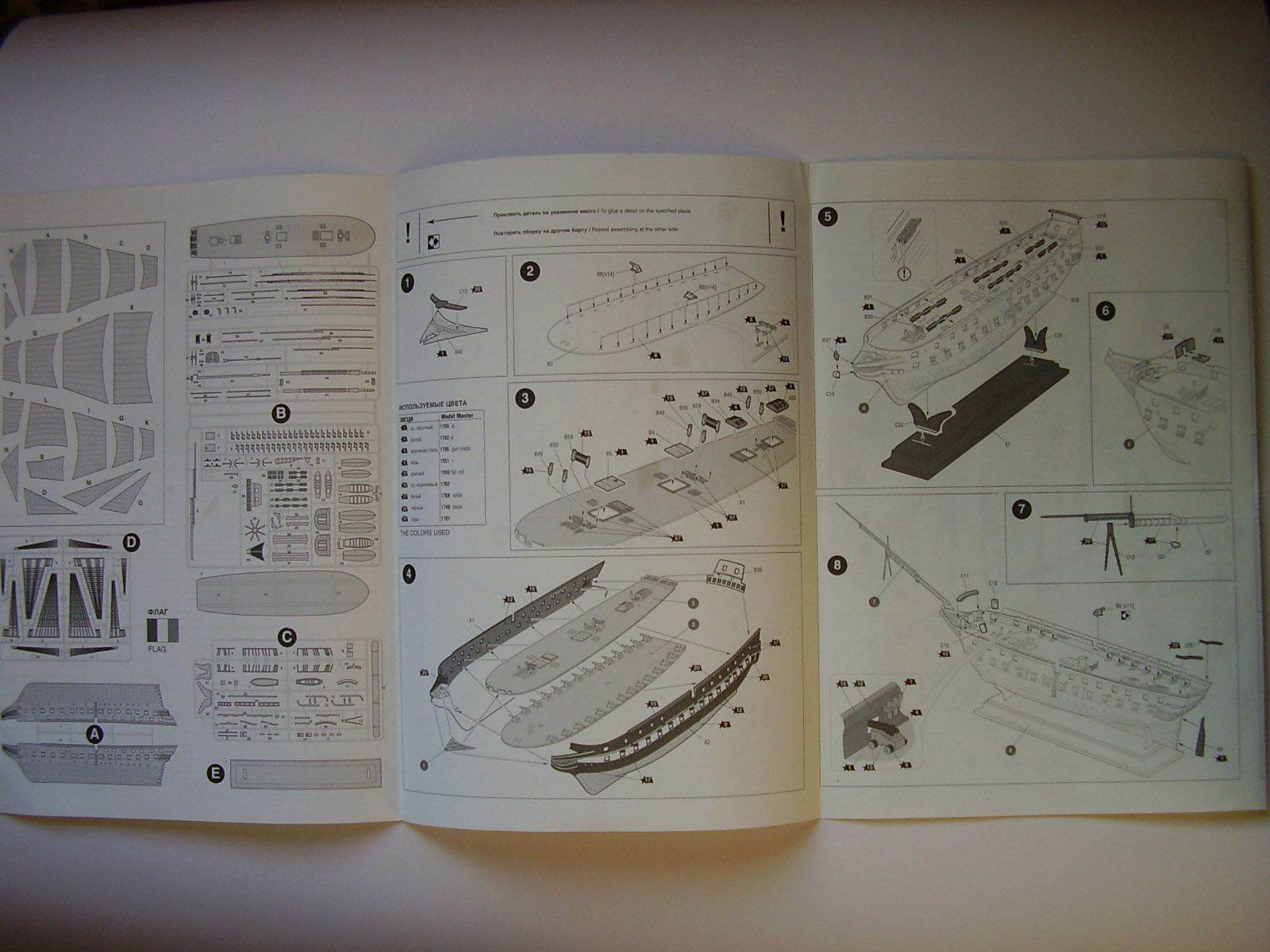 В глаза бросается неплохое качество литья. Облой присутствует, но удалить его будет несложно, смещения пресс-форм замечено не было. Правда что творится внутри «скорлупок» лучше не смотреть. Ванты в наборе неплохие, но какие-то слишком ровные что ли, масштаб позволяет связать выбленки самому. Инструкция понятная, но в ней содержится крайне мало информации по такелажу – что свойственно для «Звезды». Бумажный флаг ИМХО страшненький, ну и нитки мне кажется тоже не айс.