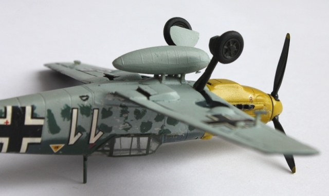Выдавил самодельный фонарь из упаковки от рубашек, болванку выстругал из дуба и отполировал. Расшивку углублял самодельным скрайбером – первый опыт... Подвесной бак от чешского КР AviaCs-199 от КР. Пушки и пулемёты тоже в первый раз сделал из медицинских игл – тогда с ними были проблемы – не достать (одноразовые шприцы с иглами появились гораздо позже, лет через 10-12). Заднее колесо, если не изменяет память, от нововского «спитфайра» :-)