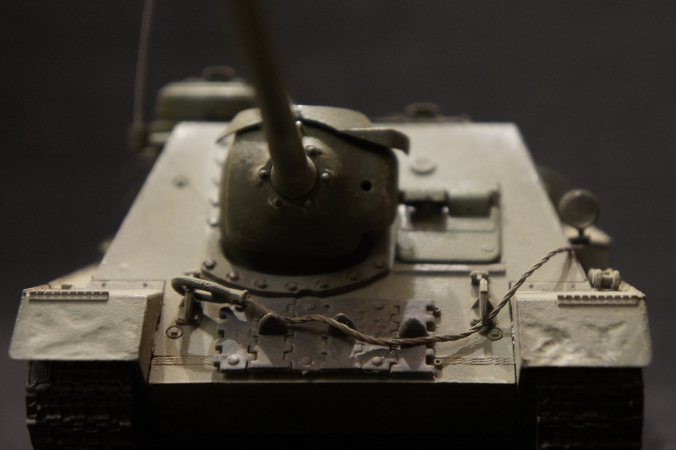 Ну что за любовь к послевоенным передним крыльям-брызговикам? Или отрывайте, или ставьте скруглённые. В каждой гусенице должно быть 72 трака, не больше и не меньше. Натяжение регулируется поворотом кривошипа ленивца. Передняя смотровая щель ком. башенки приклеена криво. Передние брызговики помяли, а задние девственны. Жуткие Драконовские следы "пресс-форм" на бандажах катков. Можно хоть одно фото, где они такие гипертрофированные? Почему нет потёков топлива на лобовом верхнем листе возле горловины? Вы не поинтересовались просто, что это за заглушка возле маски орудия (справа по ходу) Оптику Вы возможно и ставили, но на фото не просматривается. Гуси по виду некрашенная пластмасса. Где хоть какой обвес, в 1945 году наши машины были увешаны как немцы в 41-ом. Три несчастных грунтозацепа это зачем, их надо или комплект - 24 шт., или нечего цеплять. И что с лобовой балкой - если она была, то ВЛД над ней торчала на 30 мм - почти 1мм в масштабе. А вгладь сваривали только без балки. А ком. башенка соответствует декабрю 44-го- нач. 45-го. Но для Вашего возраста смастерили хорошо.