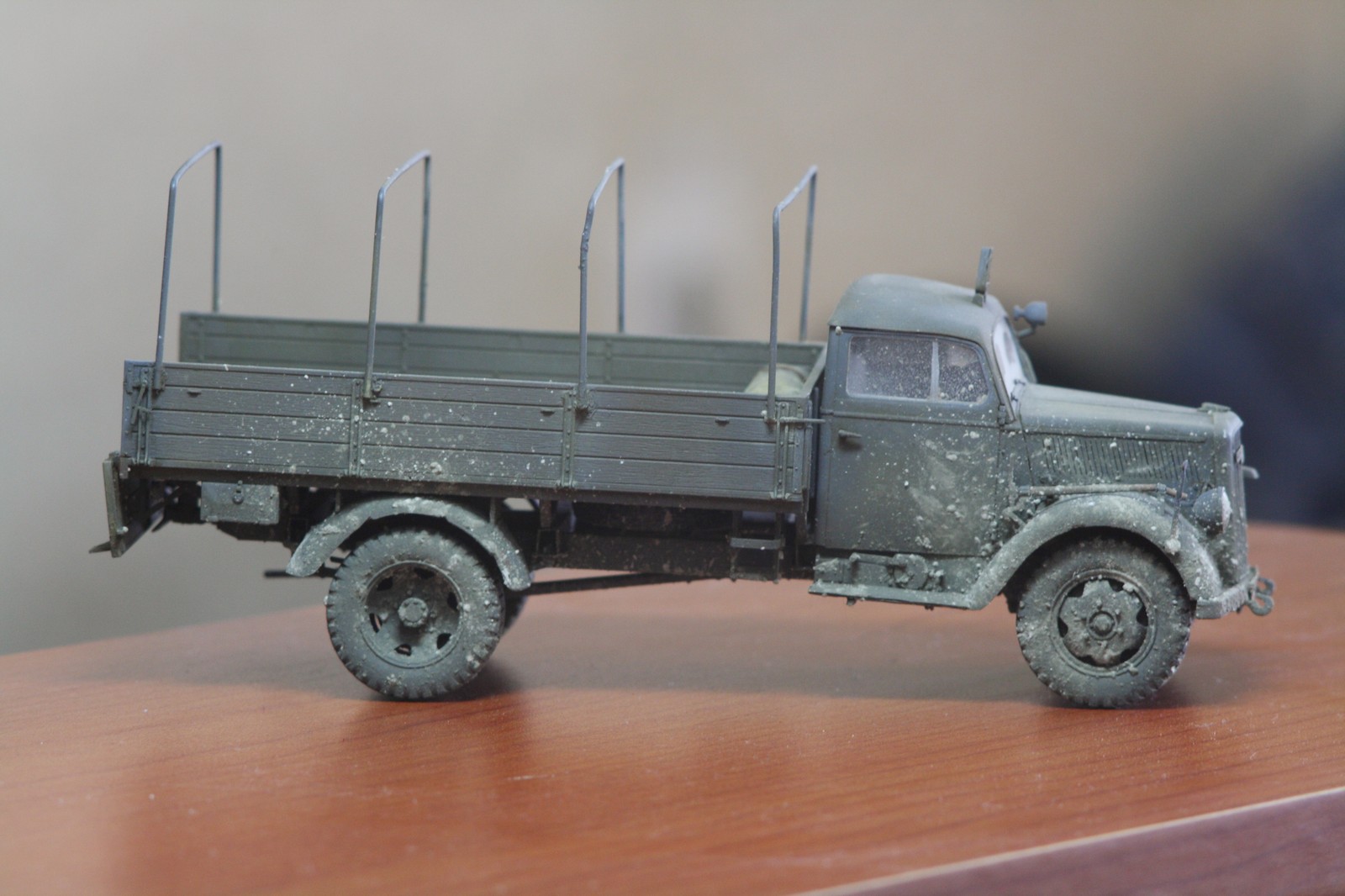 Первая реплика моей жены после взгляда на вашу модель: "Темной ночью везя труп на кладбище, сбился с дороги и въехал в курятник ?"Шутка. (грязь не удалась и снизу и сверху,тент скатанный не плохо получился, а перевязан как будто скотчем замотали)