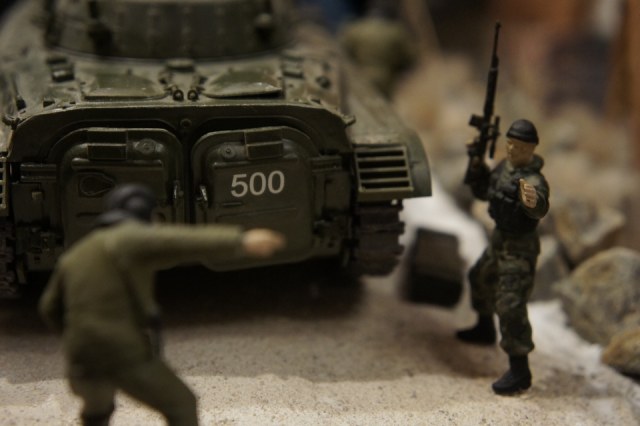 хотел отобразить на диораме бои на северном кавказе во время чеченской кампании,а именно в гористой местности...модели собтаны из коропки,без доработок..бмп окрашена аэтографом,тонирована пастелью.....снег сделан из соды,камни и ростительность-природный материал....основание-алебастер с песком..<<СОБИРАЛАСЬ ДИОРАМА ЛЕТ В 16,УРОВЕНЬ БЫЛ НЕ ВЫСОК,ТОЛЬКО НАЧИНАЛ ПОНИМАТЬ ЧТО ТАКОЕ ШПАКЛЕВКА,СМЫВКА И.Т.Д....ДА И УСИДЧИВОСТЬ ТОЛЬКО НАЧИНАЛА РАЗВИВАТЬСЯ)))ПОЭТОМУ НЕ СУДИТЕ СТРОГО)))>>