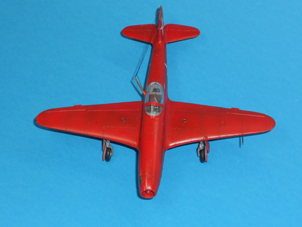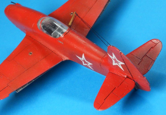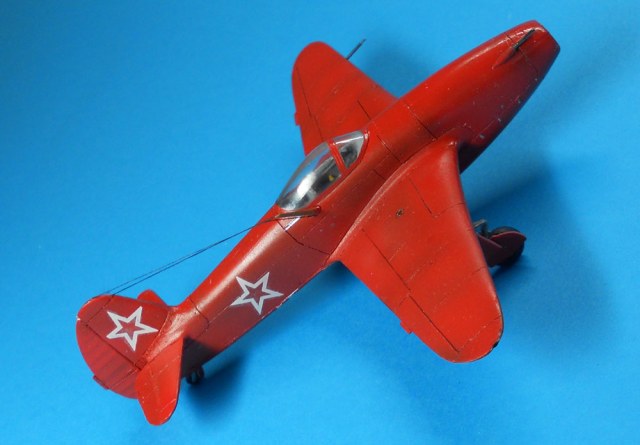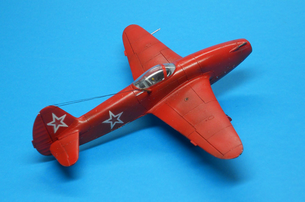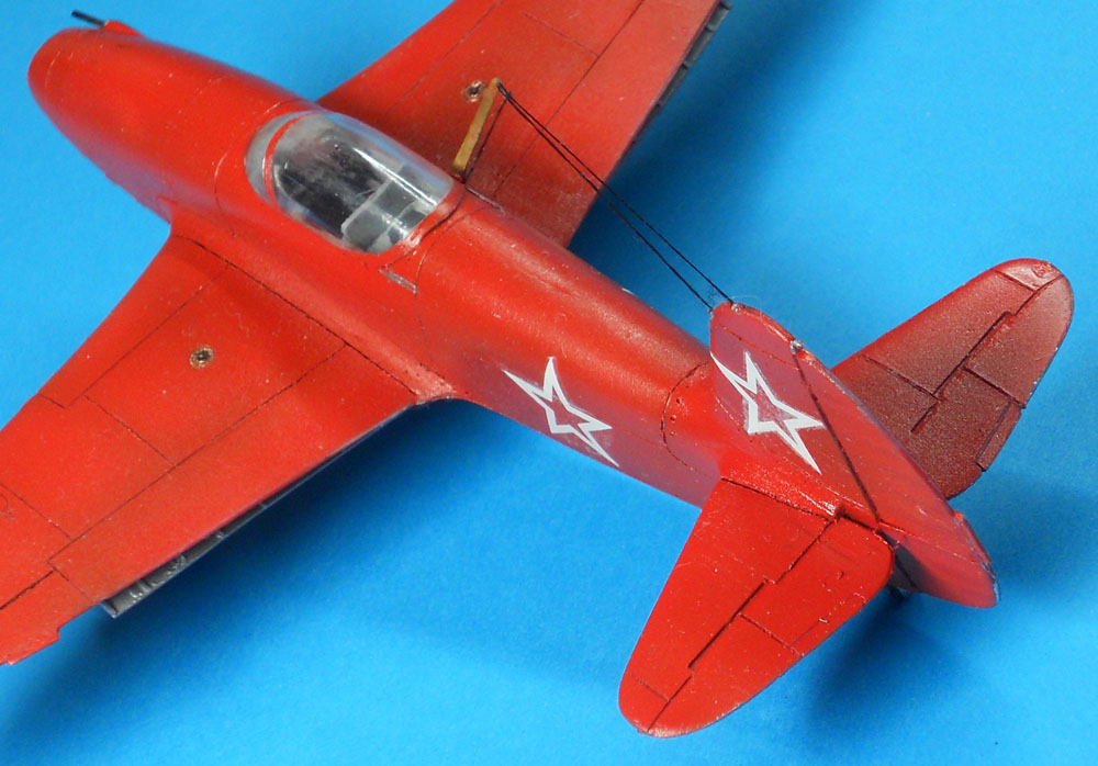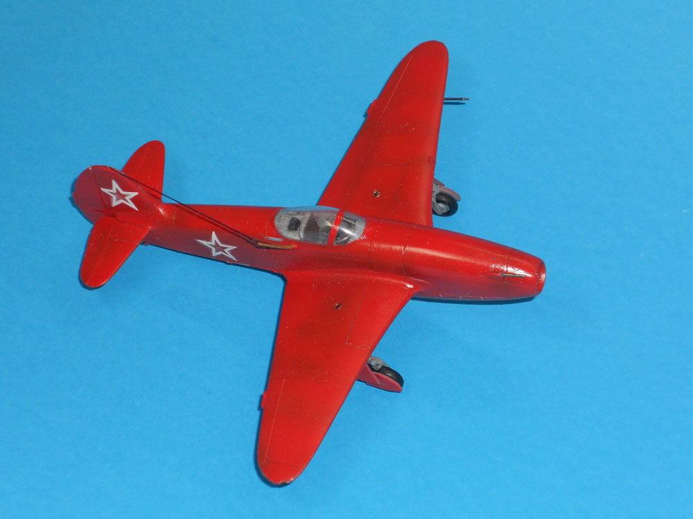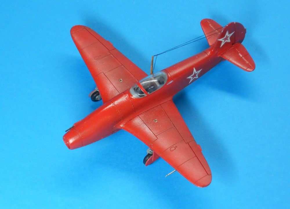 C неделю назад пришла ко мне очередная партия амодела, перед тем как уити в постройку монстра Ту-126 решил собрать для разминки эту козявочку. Хотя я и стараюсь не красить модели "как у всех" однако "красноперый" все-таки показался мне самым зрелищным.При выборе прототипа руководствовался тем, что очень мало 15-х было выпущено с полным комплектом вооружения и радиооборудования, на воздушном параде в 1947 машины были без пушек и радиополукомпаса. Свой як я сделал ориентируясь на первую серию самолетов собранных для несостоявшегося парада в 1946-ом, самолет с одной пушкой и без маркерного приемника с полукомпасом- отсюда отсутствие антенн. Подвела ревелловская красная эмаль- сохнуть не хотела никак им начала есть пластик не смотря на промежуточный слой серебра от звезды и прешейдинг. Смывку не делал, ибо самолеты послужили недолго, а вот жаропрочные панели за соплом ободрал т.к. при взлете и рулении особенно с бетонки движок, струя которого била в землю была как пескоструйка, да и ощущения пилотов от стального заднего колеса были наверное незабываемыми. Из доработок: -силовой набор и прицел в кабине, правда не мешало сделать и ремни; -пушка и ПВД- как и всегда иглы; -отдельные элементы обклеены фольгой; -накатан клеп на жаропрочной части брюха, болты на капотах; -сделаны из доширака щитки-закрылки и триммеры РН и элеронов; -антена-чулок; -БАНО- прозрачная витражная краска; -ХАНО- тянутый прозрачный литник; -шланги пневматики в нишах. В общем модель приятно пилится, легко красится и заметна на полке не смотря на размер.