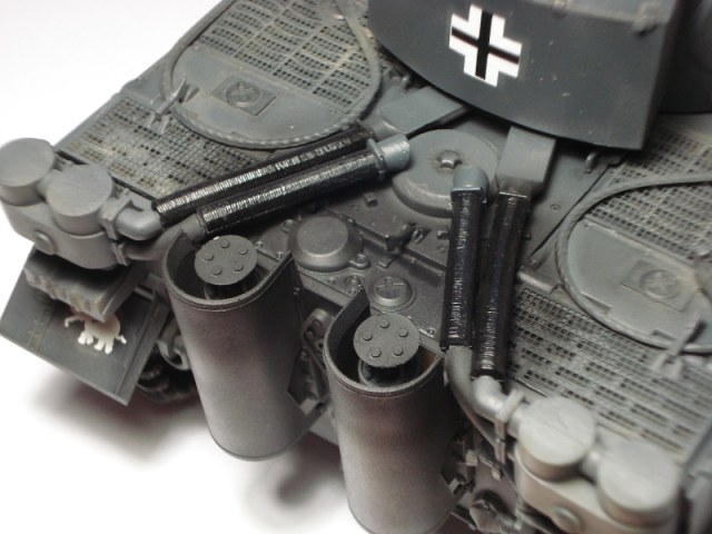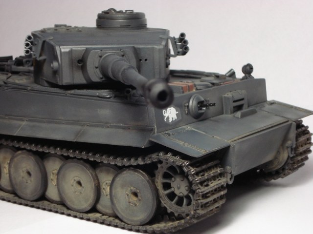 Странно, что никто не говорит, не было предсерийника ни с юбками, на с грантометами, ни с буксировочными тросами. Это собран ранний тигр от Академии, таких в панцерграу не было, особенно с мамонтами. А корма у предсерийных совсем другая. То есть собран один танк, окрашен в другой. Вот и вся матчасть, или её отсутствие, как угодно. Если обстрагироваться от вышесказанного, окраска и тонировка на приличном уровне. Вы собирали с полным интерьером. а где боекомплект?