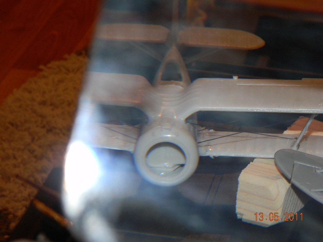Можно было сделать ниши шасси, и надо прорезать в капоте отверстия для выхлопных труб. Ту, что слева внизу надо перекрасить в тёмный цвет (красный не годится).