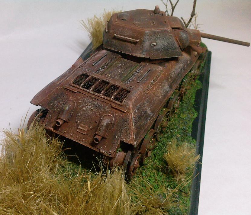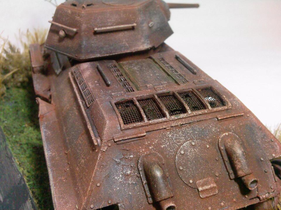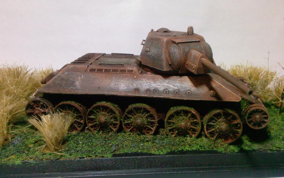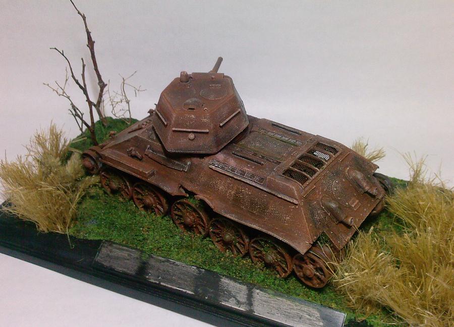 Соглашусь с мнениями, что танк не совсем похож ни на сгоревший ни на брошенный. Но мне понравилась идея и исполнение! Думаю, можно сказать, что танк году в 41м поспешно собирали для обороны и выкатили из завода непокрашенным. Так и бросили в бой. Там его при повреждении оставили. Ну а за счёт того, что голая сталь была незащищена от коррозии, то он быстро поржавел.