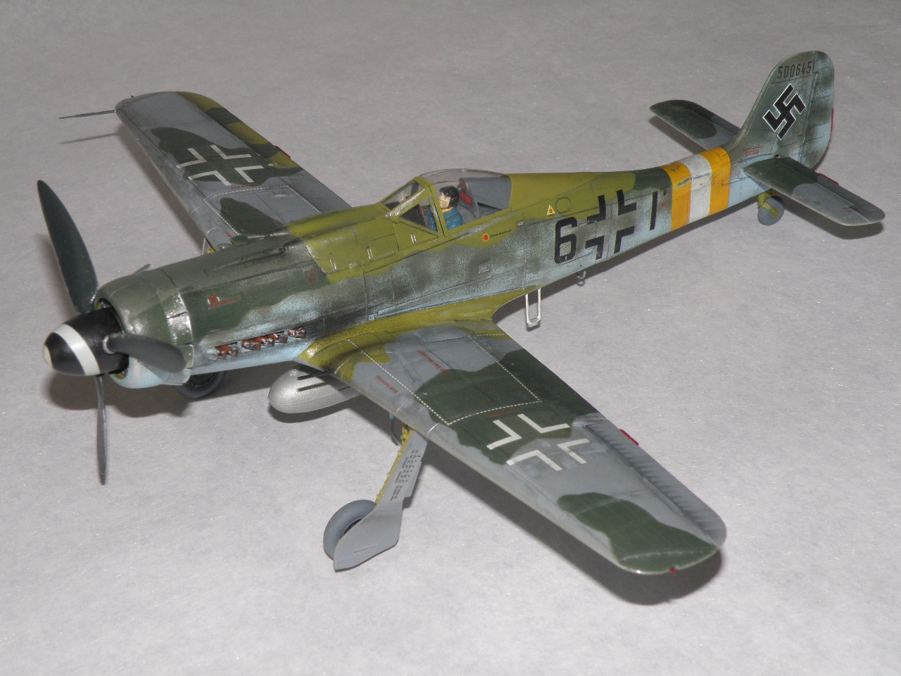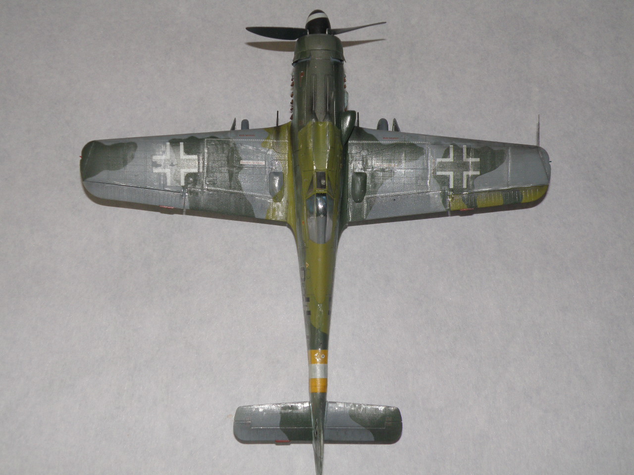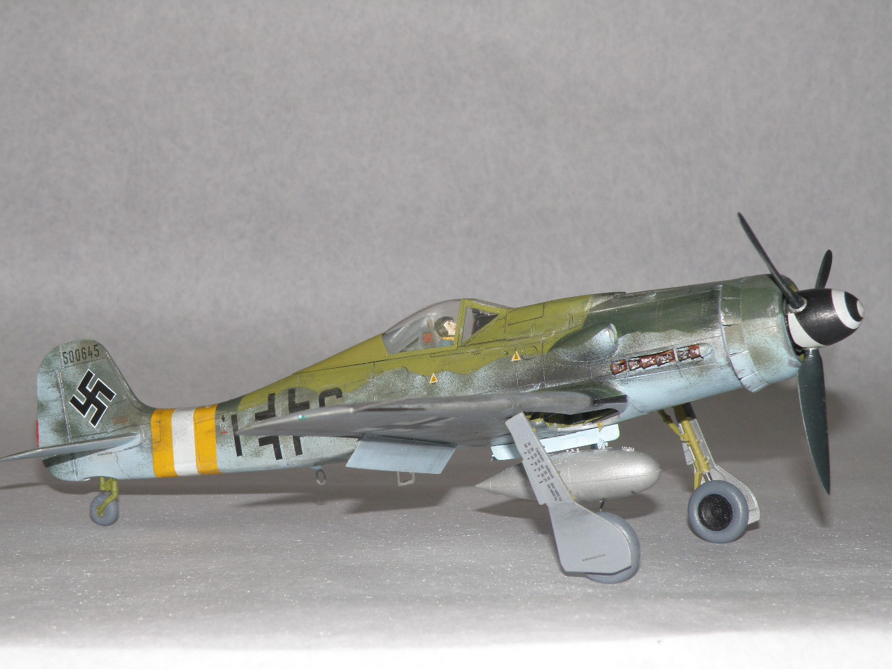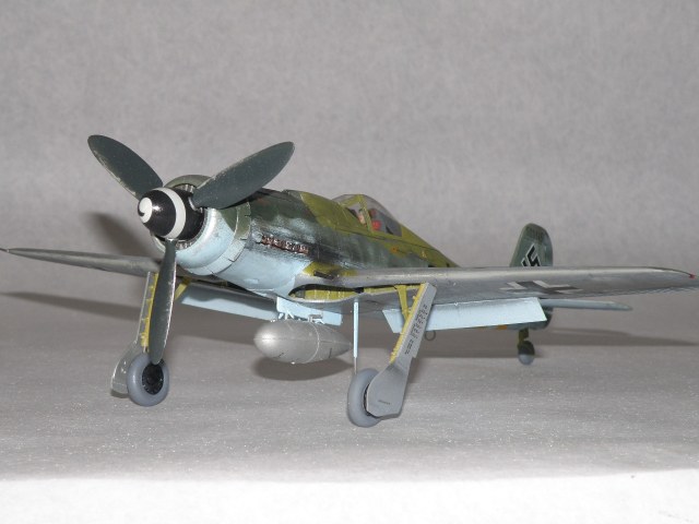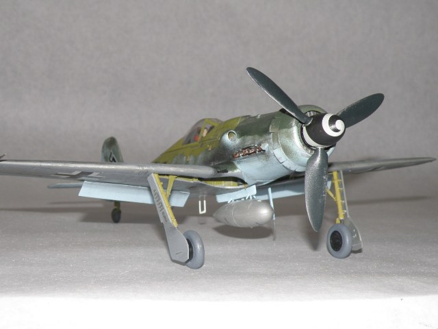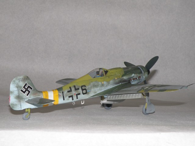 Провисала на Дорах не антенна, а трос натяжителя антенны (сама антенна, это то что идет от фюзеляжа к тросу) только на фонаре 8-190.1025 ГалландХаубе (позднего типа), как на данной модели. Резина только темно коричневого цвета (это поздняя машина, да и на ранних FW резины серого цвета не было), делалась из каучука тип Buna-S, завод Continetal. Не надо сравнивать с Bf.109 там были другие требования и производства. Данная машина 500 серии завода Mimetall Erfurt была сбита под Altenstadt и является одной из 5-и известных Дор с килем от Ta-152. Верхняя крышка капота позднего типа из трех частей без каких-либо выштамповок под EDSK и с выштамповкой под подушку моторамы(каплевидного типа нарост внизу верхей части капота), на модели капот раннего типа из пяти частей (только 210 серия Fw.190D). Цвет машины: передняя часть вместе с капотом RLM83 на основном RLM76, задняя верхняя часть RLM 81/82. Низ цвет металла, передняя часть низа крыла RLM75 (по Крэндэлу), есть мнение что возможно RLM66 или 82 (книга JaPo по цветам D-9). Нижние кресты типа B1b, то есть просто черные кресты без белого канта. Для 500 серии характерно нанесение W.Nr на обе стороны киля, что автор и сделал. Вот вкратце.