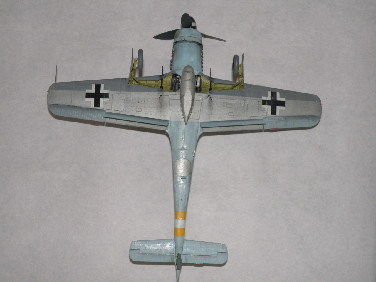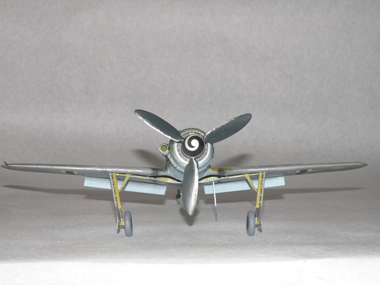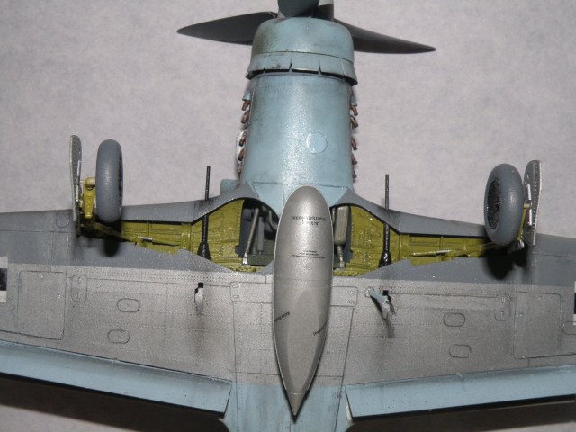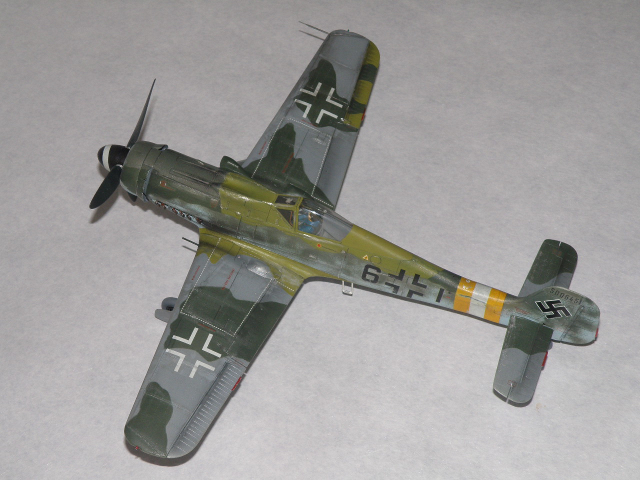 Провисала на Дорах не антенна, а трос натяжителя антенны (сама антенна, это то что идет от фюзеляжа к тросу) только на фонаре 8-190.1025 ГалландХаубе (позднего типа), как на данной модели. Резина только темно коричневого цвета (это поздняя машина, да и на ранних FW резины серого цвета не было), делалась из каучука тип Buna-S, завод Continetal. Не надо сравнивать с Bf.109 там были другие требования и производства. Данная машина 500 серии завода Mimetall Erfurt была сбита под Altenstadt и является одной из 5-и известных Дор с килем от Ta-152. Верхняя крышка капота позднего типа из трех частей без каких-либо выштамповок под EDSK и с выштамповкой под подушку моторамы(каплевидного типа нарост внизу верхей части капота), на модели капот раннего типа из пяти частей (только 210 серия Fw.190D). Цвет машины: передняя часть вместе с капотом RLM83 на основном RLM76, задняя верхняя часть RLM 81/82. Низ цвет металла, передняя часть низа крыла RLM75 (по Крэндэлу), есть мнение что возможно RLM66 или 82 (книга JaPo по цветам D-9). Нижние кресты типа B1b, то есть просто черные кресты без белого канта. Для 500 серии характерно нанесение W.Nr на обе стороны киля, что автор и сделал. Вот вкратце.