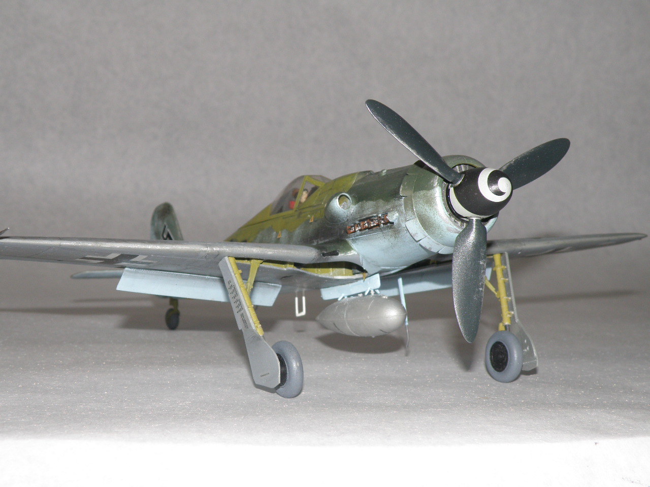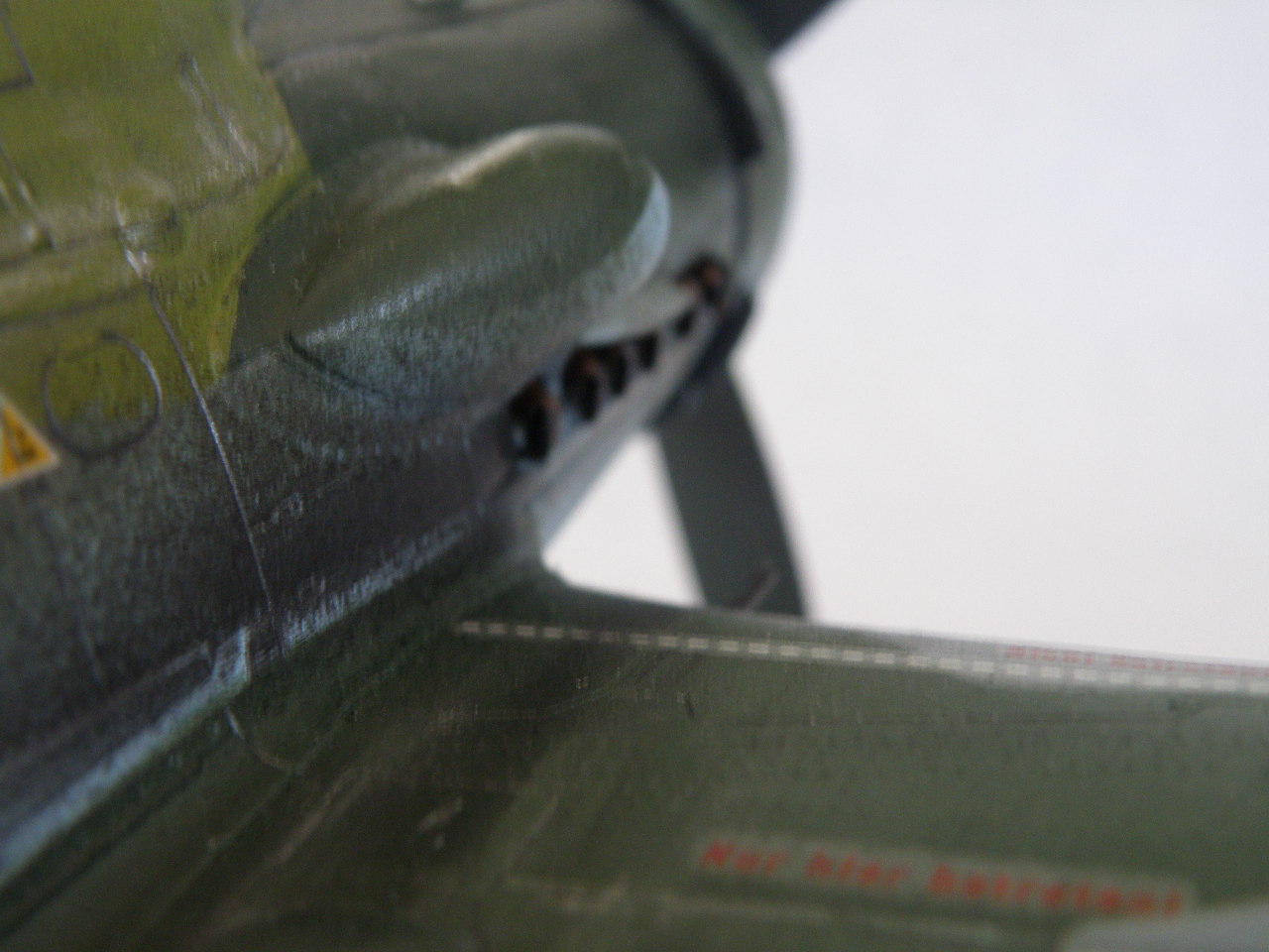 РЛM02 больше похож на пиндосовский "Цинк хромат". Окраска понятно что нестандартня - попозже поищу, но вроде видел я её в "Моделлер Айс", в выпуске про 190Д - немнго смутило расположение полей. Вообще, что по окраске бросается в глаза - это цвета и пятна на бортах фюзеляжа: очень большой набрызг. Попробуйте уменьшить давление, краску пожиже и с маленького расстояния дуть. Передние кромки лопастей ободраны до металла - а зря: они здесь деревянные. Пушки в таком масштабе (да в любом, вообще-то) лучше делать из металлических трубочек. Хотя бы рассверлить надо было обязательно. Цвет пневматиков - почему они такие серые?