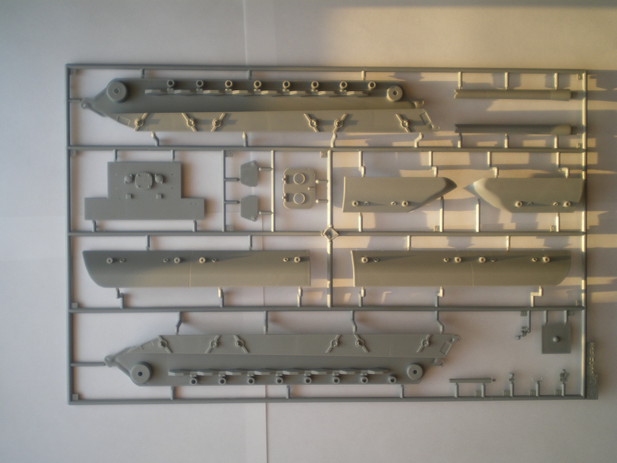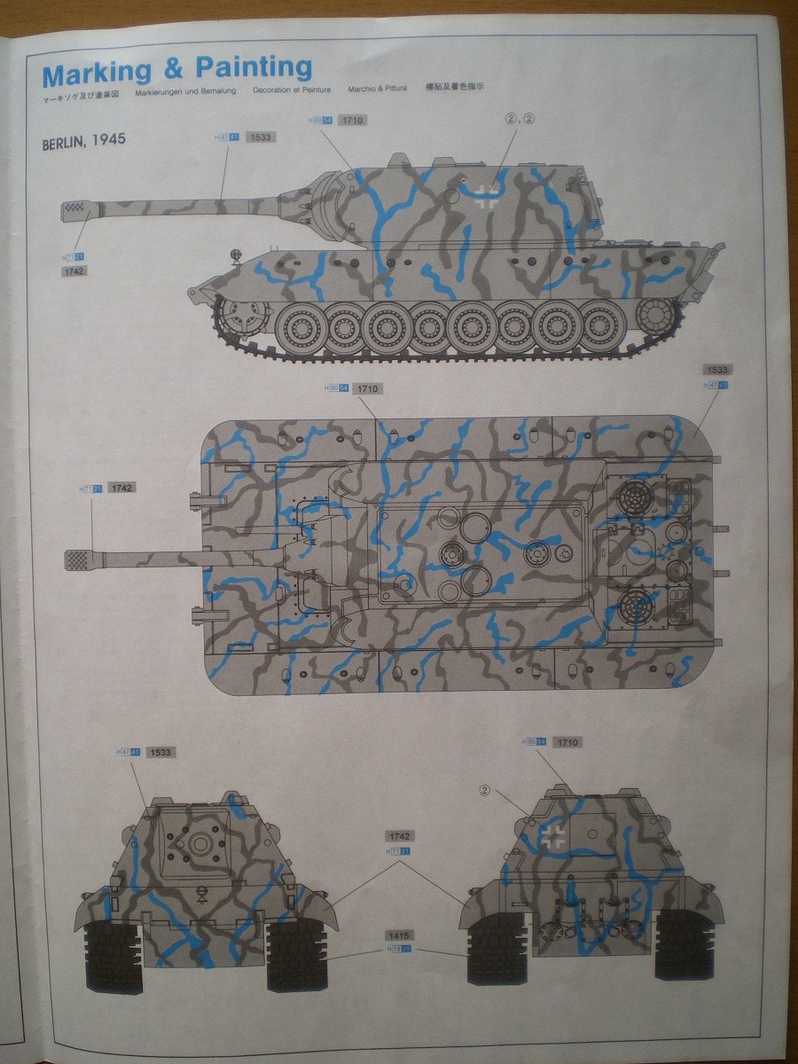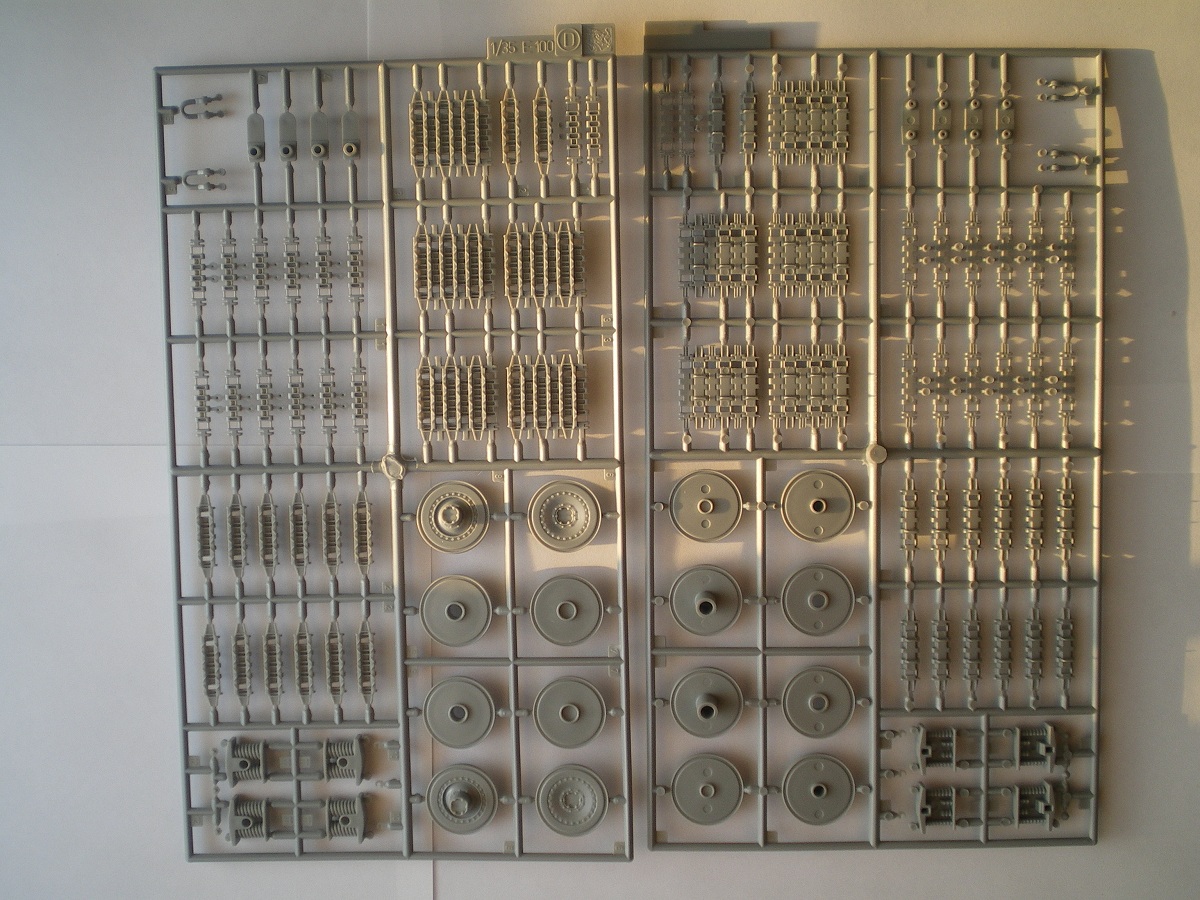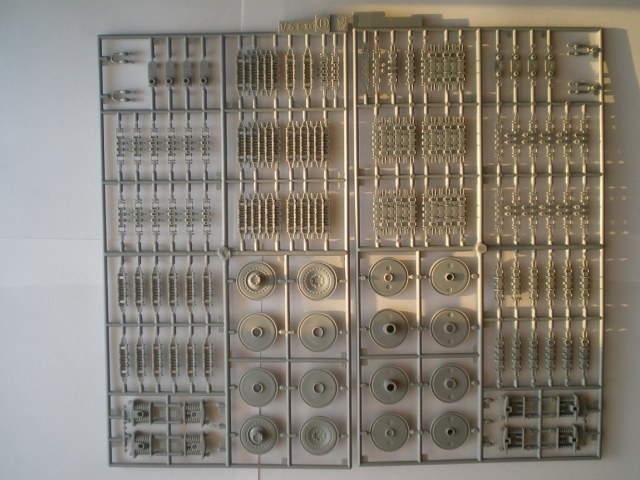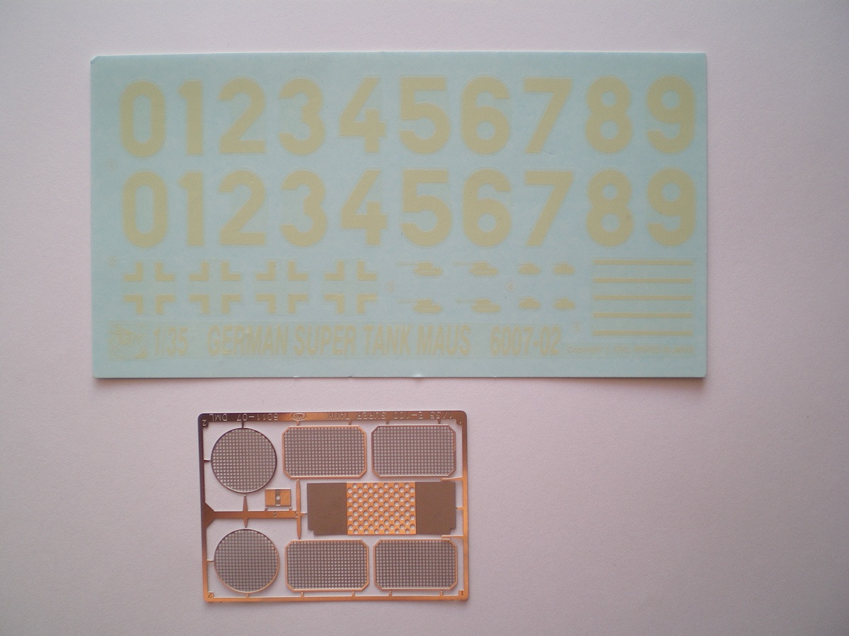 Модель довольно старая, но качество хорошее. В коробке лежат 4 больших и 2 маленьких литника с деталями ходовой и наборными гусеницами, отдельно башня от Мауса, и литник с деталями для нее, и два литника корпуса. В наборе присутствует небольшая планка фото травления - это сетки моторного отсека и дульный тормоз. Также в комплекте есть декали с номерами от 0 до 9 и крестами. Инструкция более чем понятная. В ней представлен один вид покраски модели.