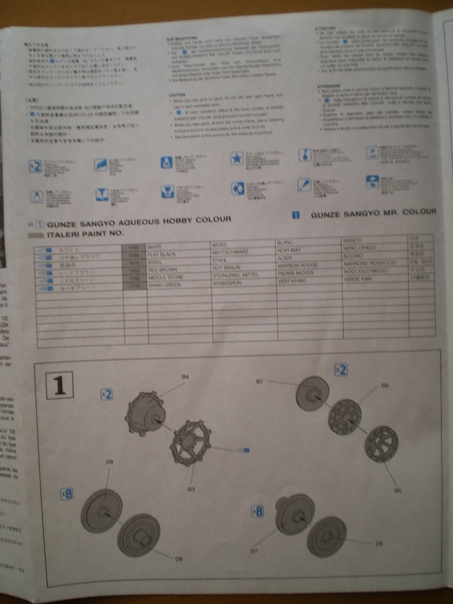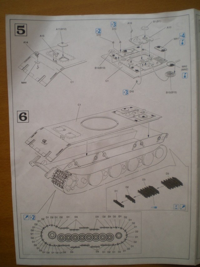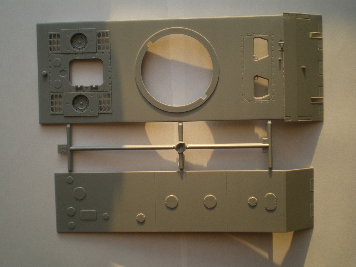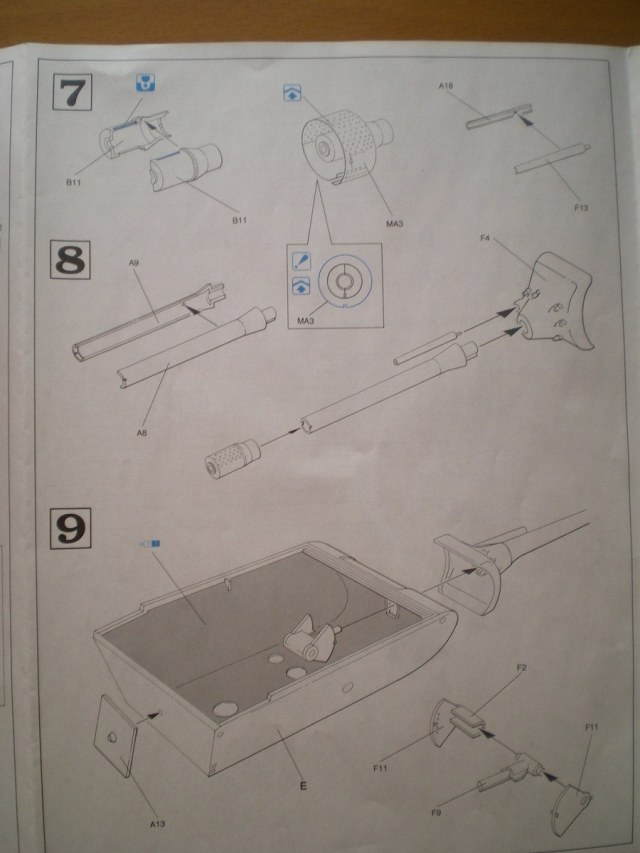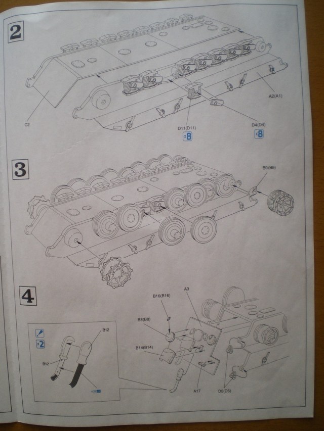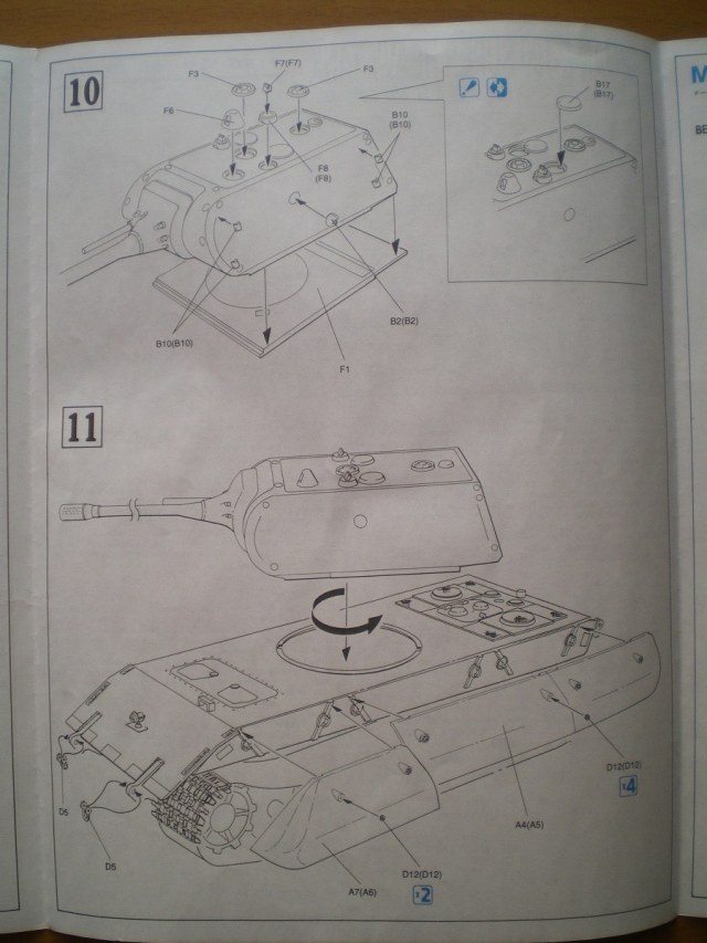 Модель довольно старая, но качество хорошее. В коробке лежат 4 больших и 2 маленьких литника с деталями ходовой и наборными гусеницами, отдельно башня от Мауса, и литник с деталями для нее, и два литника корпуса. В наборе присутствует небольшая планка фото травления - это сетки моторного отсека и дульный тормоз. Также в комплекте есть декали с номерами от 0 до 9 и крестами. Инструкция более чем понятная. В ней представлен один вид покраски модели.