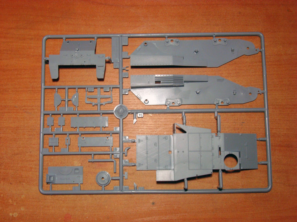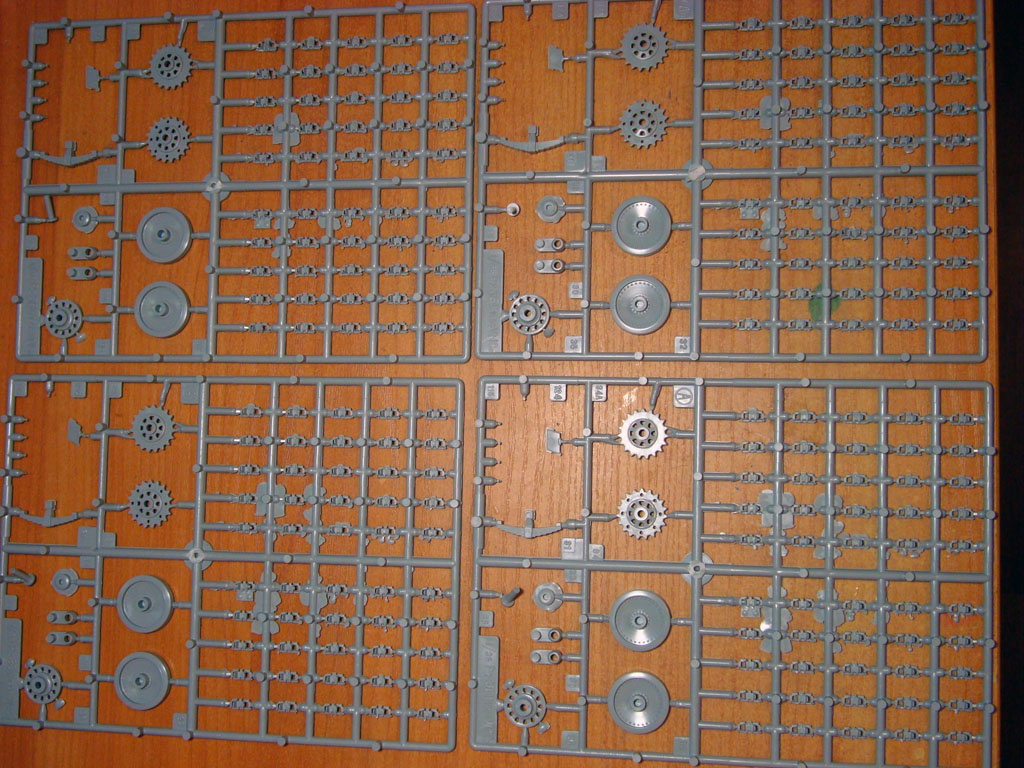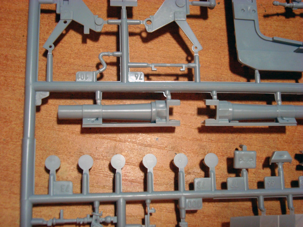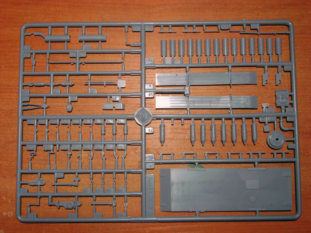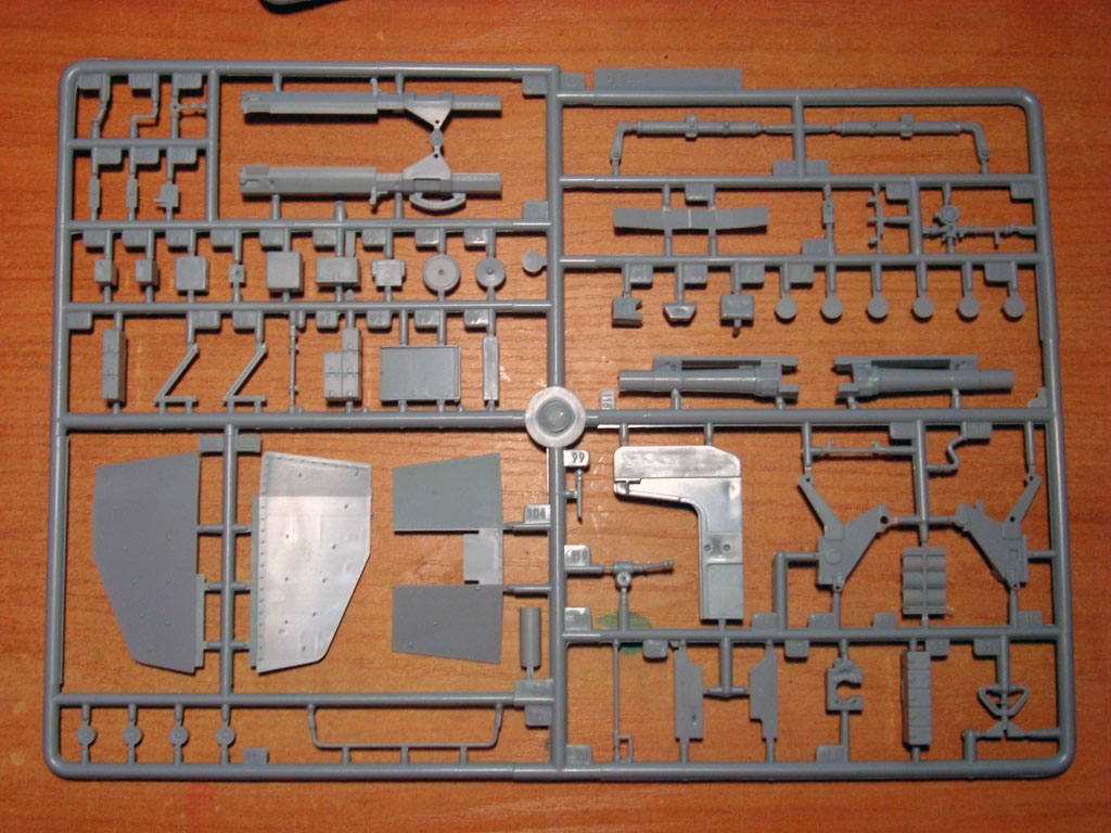 В картонной коробке находятся 3 больших и 4 маленьких литников серого цвета. Качество отливок: большое количество облоя, есть утяжки, смещения пресс-форм не заметил. Деталировка довольно четкая.Часть литников упакованы в полиэтиленовый мешок, а часть лежала просто в коробке, некоторые детали уже были оторваны.