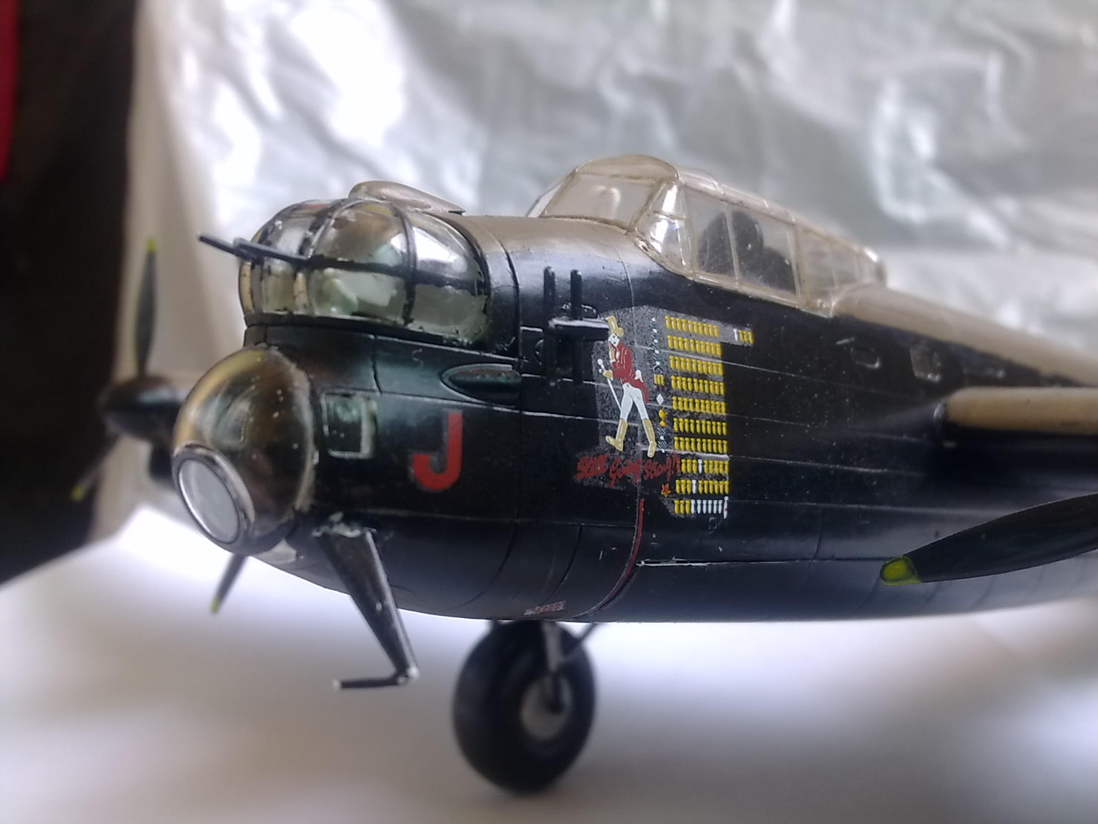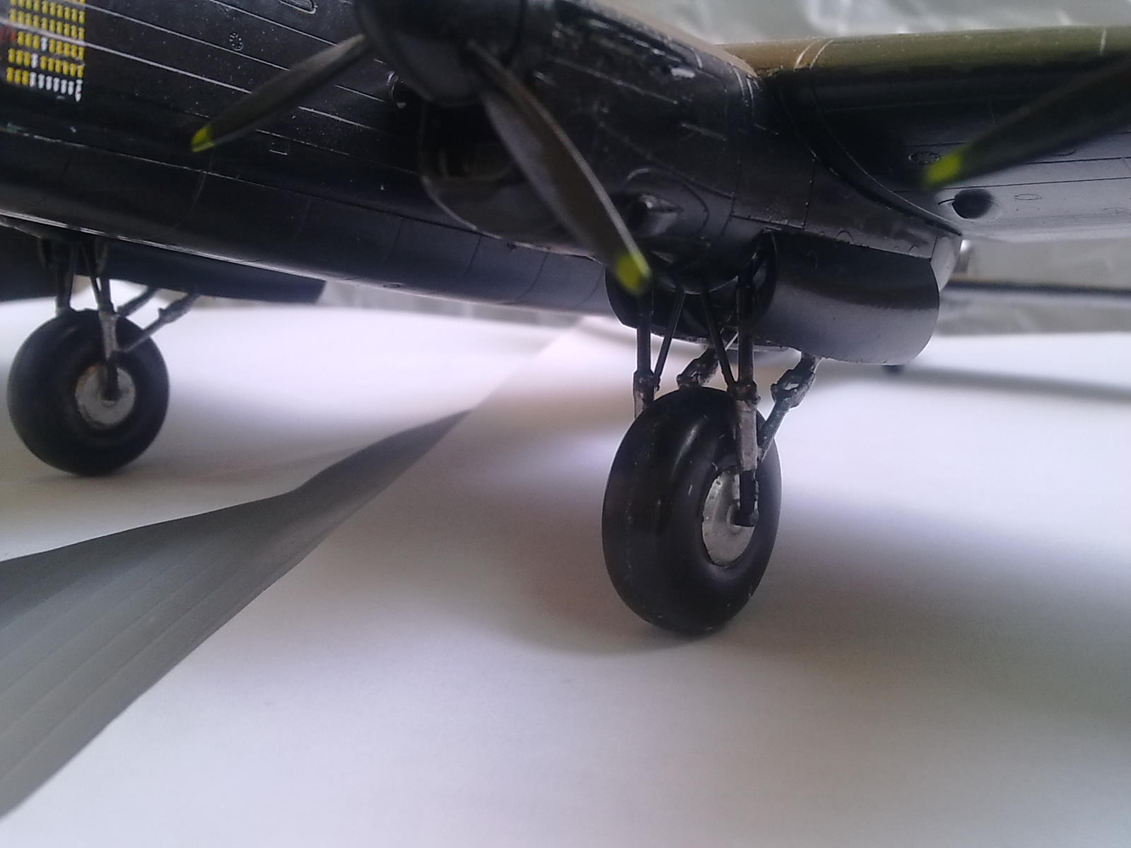Полностью согласен с замечаниями коллег. Плюс ещё одна ложка дёгтя - чёрная краска на нижних поверхностях была глубоко матовой. Хотя сам не безгрешен. По молодости и спешке запорол я в своё время один Ланкастер в модификации "Дамббастер". Теперь стоит горемыка как память о первых работах и детям как игрушка (Шасси , тормозные щитки убираются, элероны и рули высоты двигаются). На вашем ките предусмотрены такие опции?