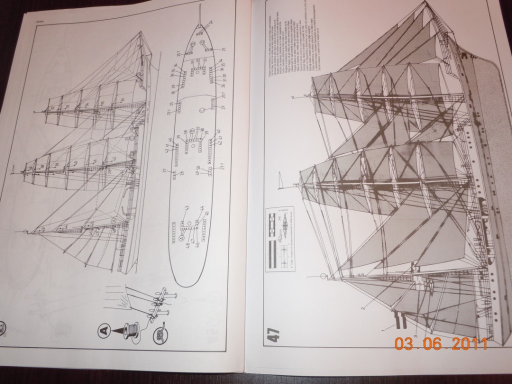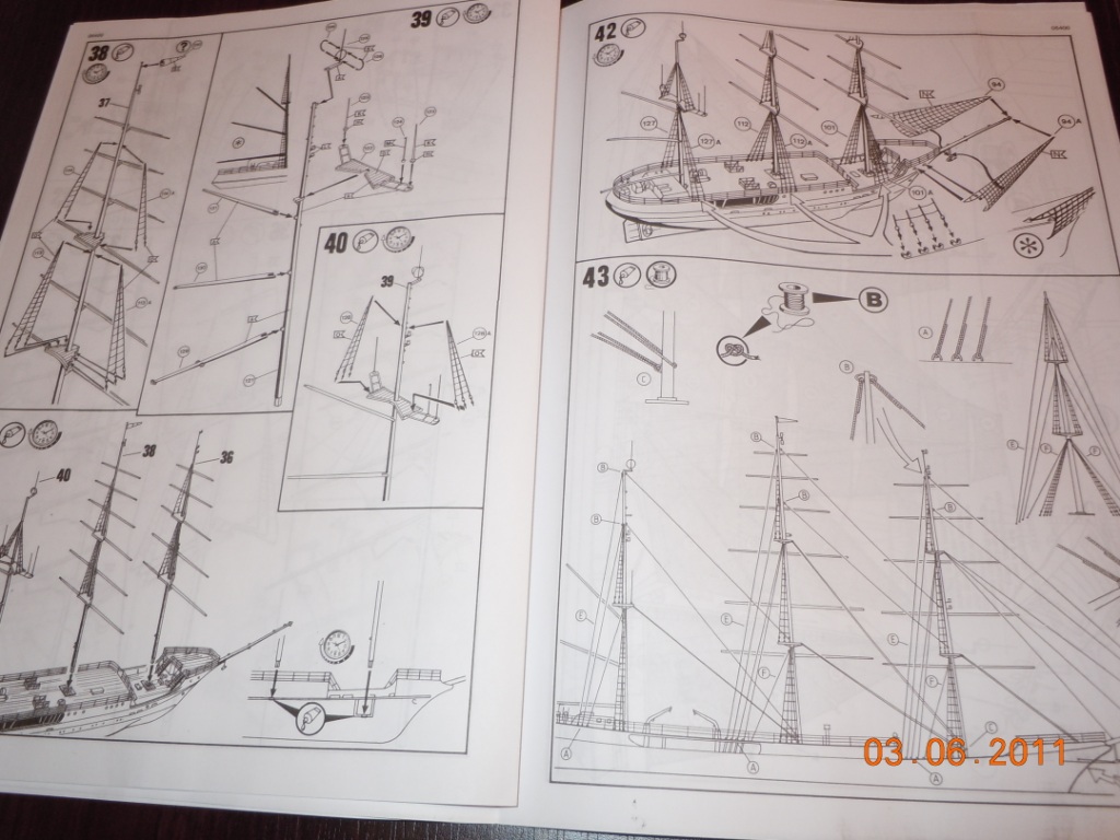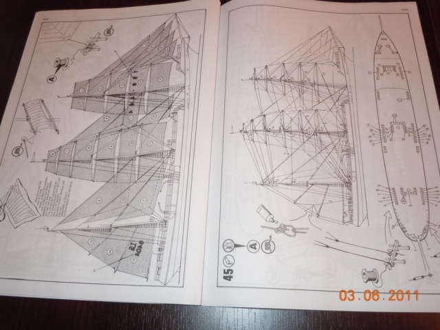 Порадовало присутствие нагельных планок и план укладки снастей, в то же время производитель дает весьма косолапую версию крепления снастей на самих парусах (стр. 44-45-46). И здесь без литературы не обойтись. В книге Цурбана "Парусно-моторные суда" есть пример трехмачтовой баркентины, можно воспользоваться другими источниками для трехмачтового барка.