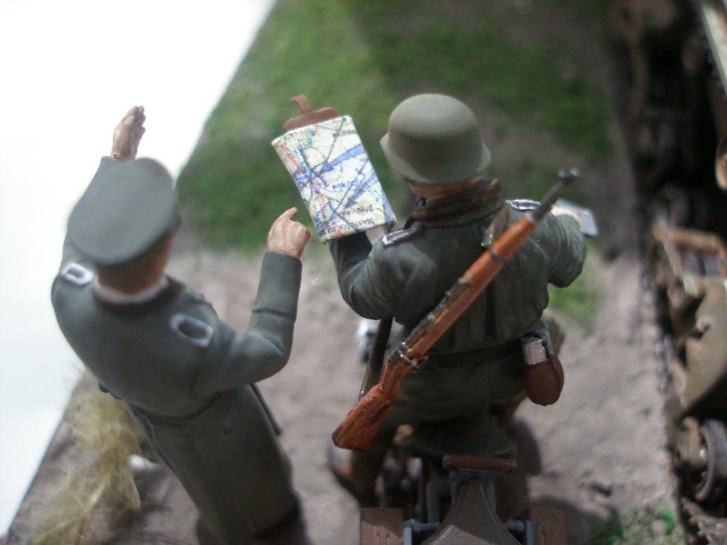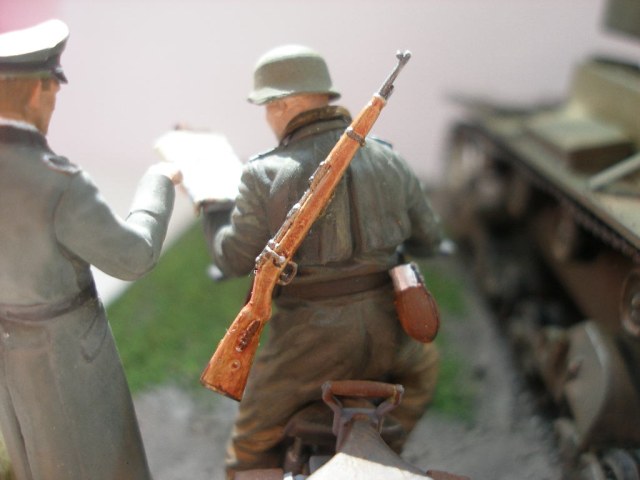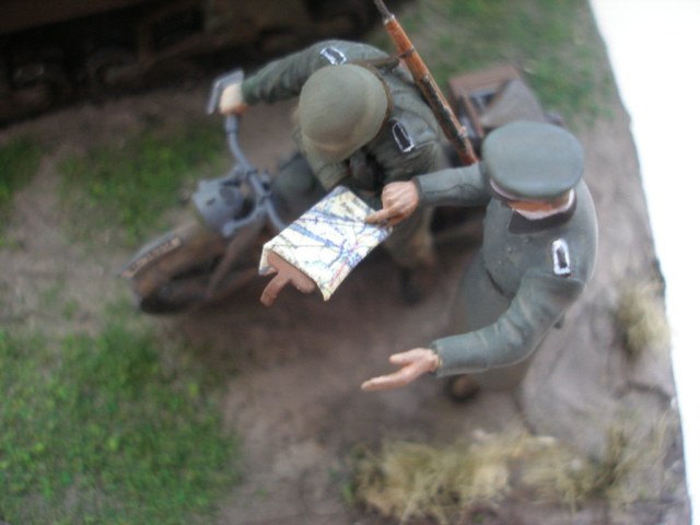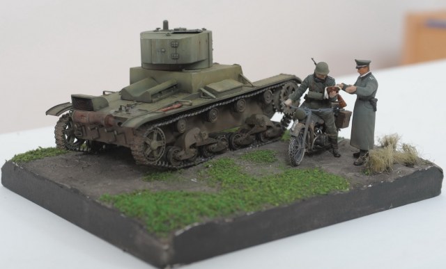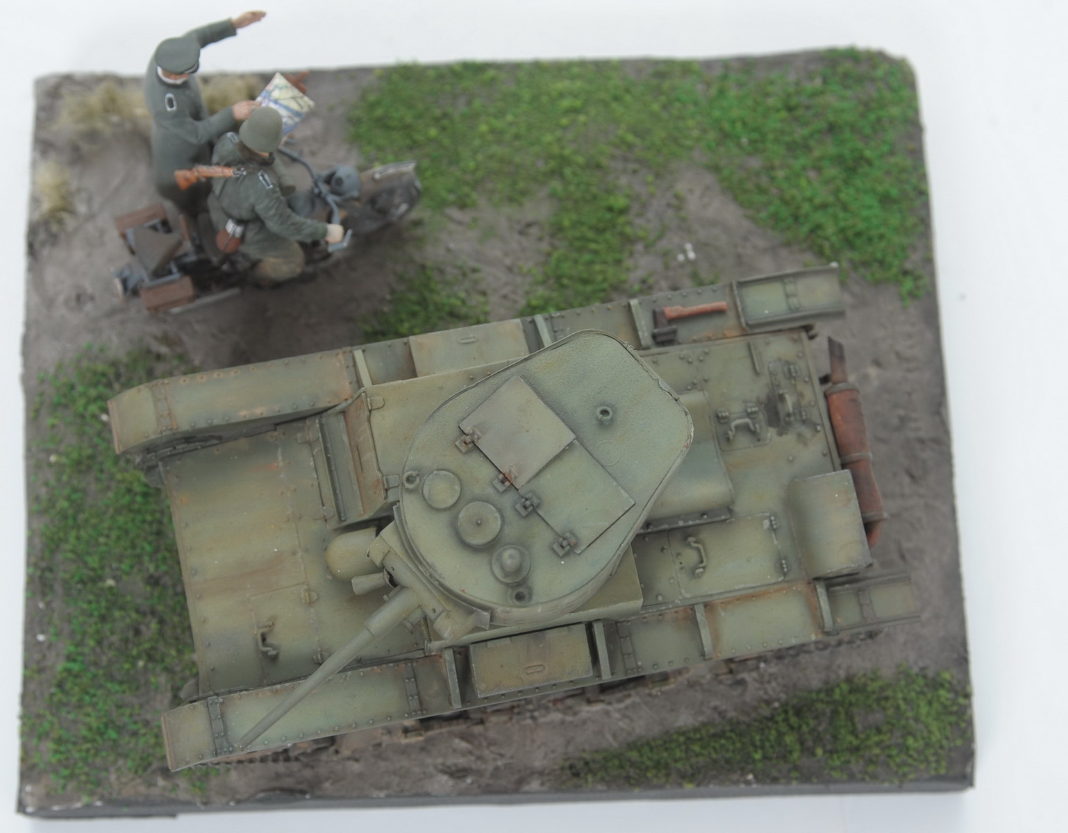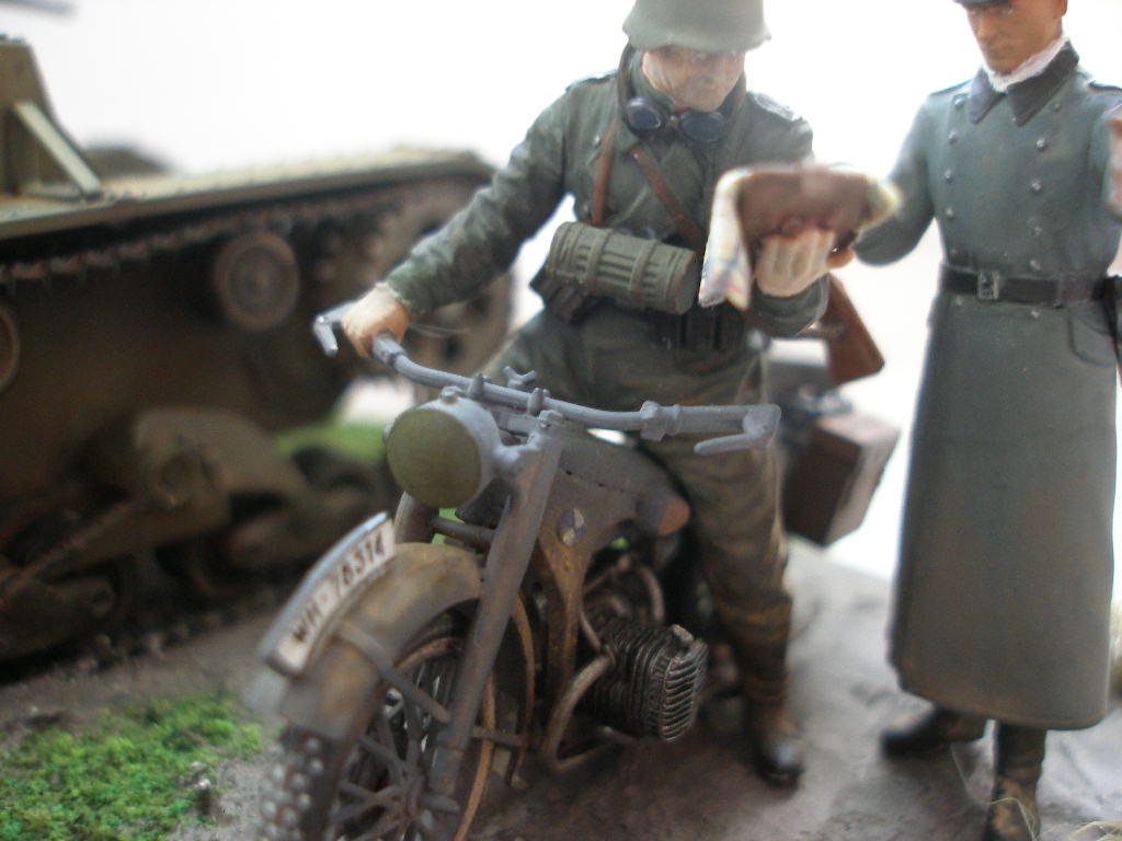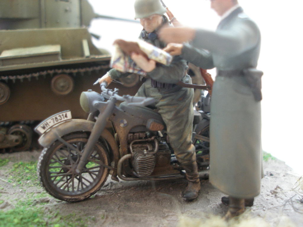 ОТ себя скажу лишь очень резкий переход гусениц, и испанский загар офицера видимо из греции приехал где на лечении был. Очень много моделей переглядел и скажу честно плохая матчасть и хороший окрас лучше, чем плохой окрас и великолепная матчасть. Очень много моделей перевидал точных облитых с ног до головы шпаклевкой и все хвалят поздравляют, а танк на кусок Г похож. ОТ меня пятерки за танк и мотоцикл, фигуры очень редко у кого получаются сразу и хорошо.