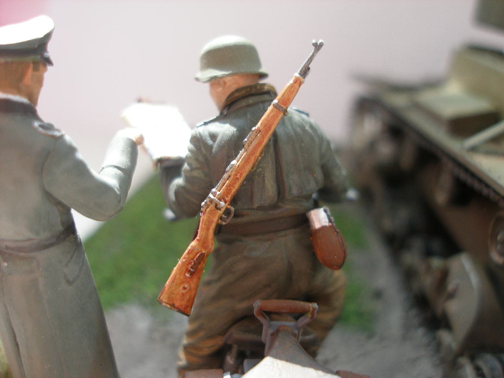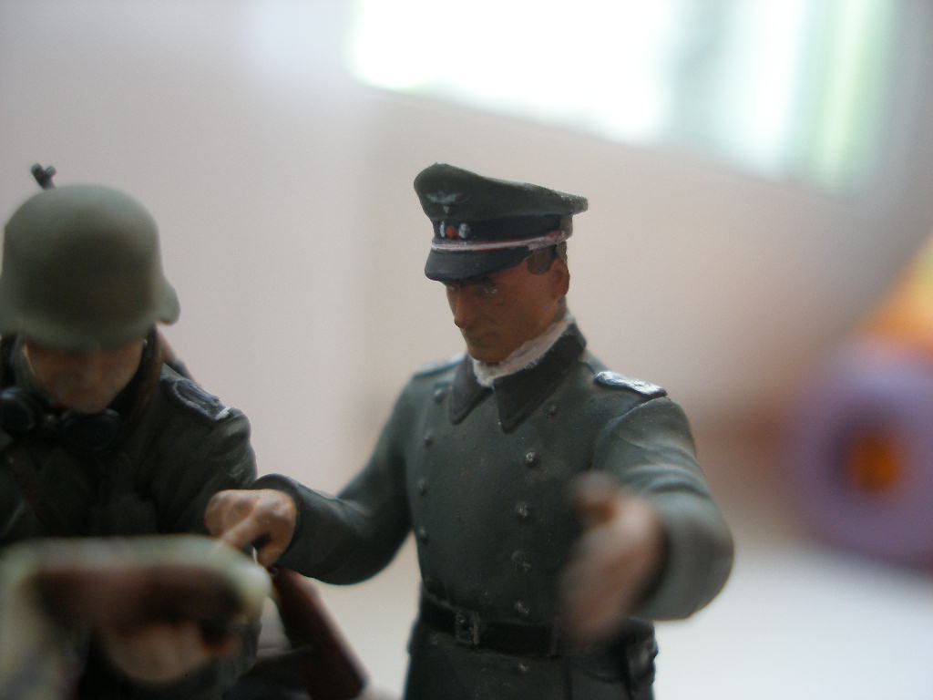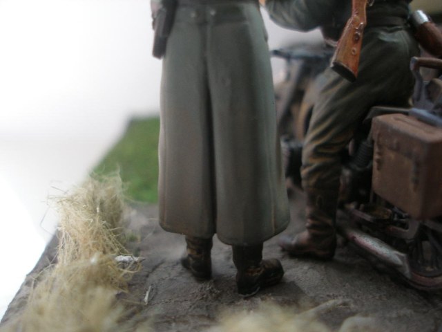 Я так понял, ремешок на каску все не делают принципиально. ))) У офицера погоны унтера. Цвет воротника шинели (почему то наглухо застегнутой летом) темно зеленый. На фото - черный. Над воротником не понятное белое (шарф серый, рубашка так торчать не может). На мотоциклисте - кожа, следовательно, может (и должна) поблескивать.