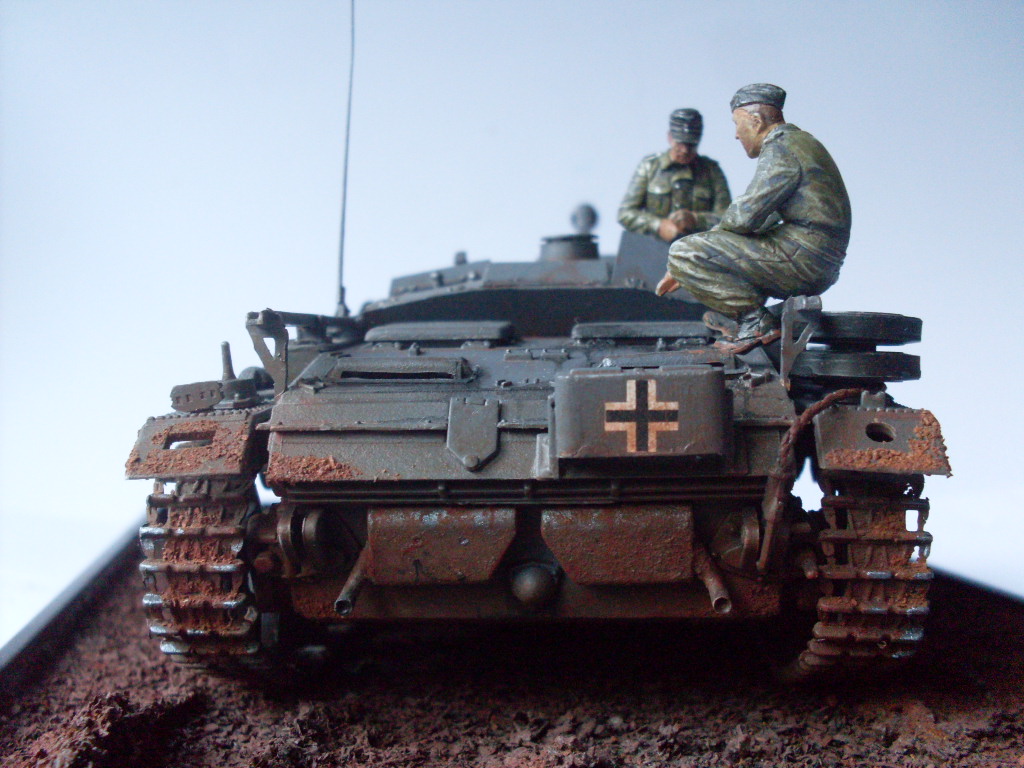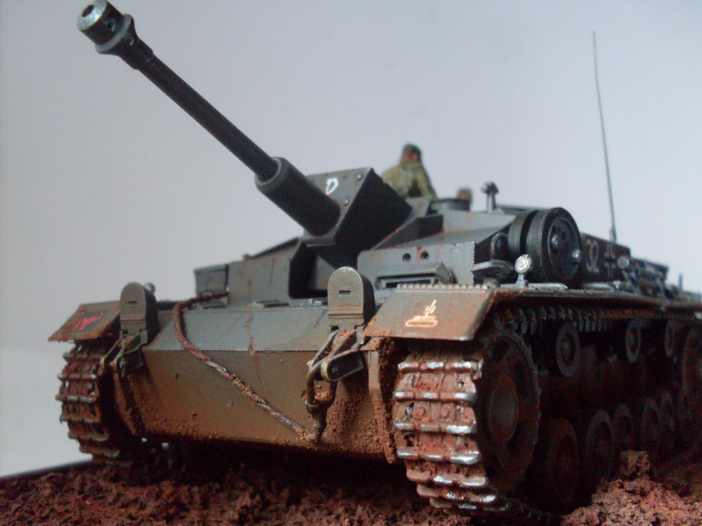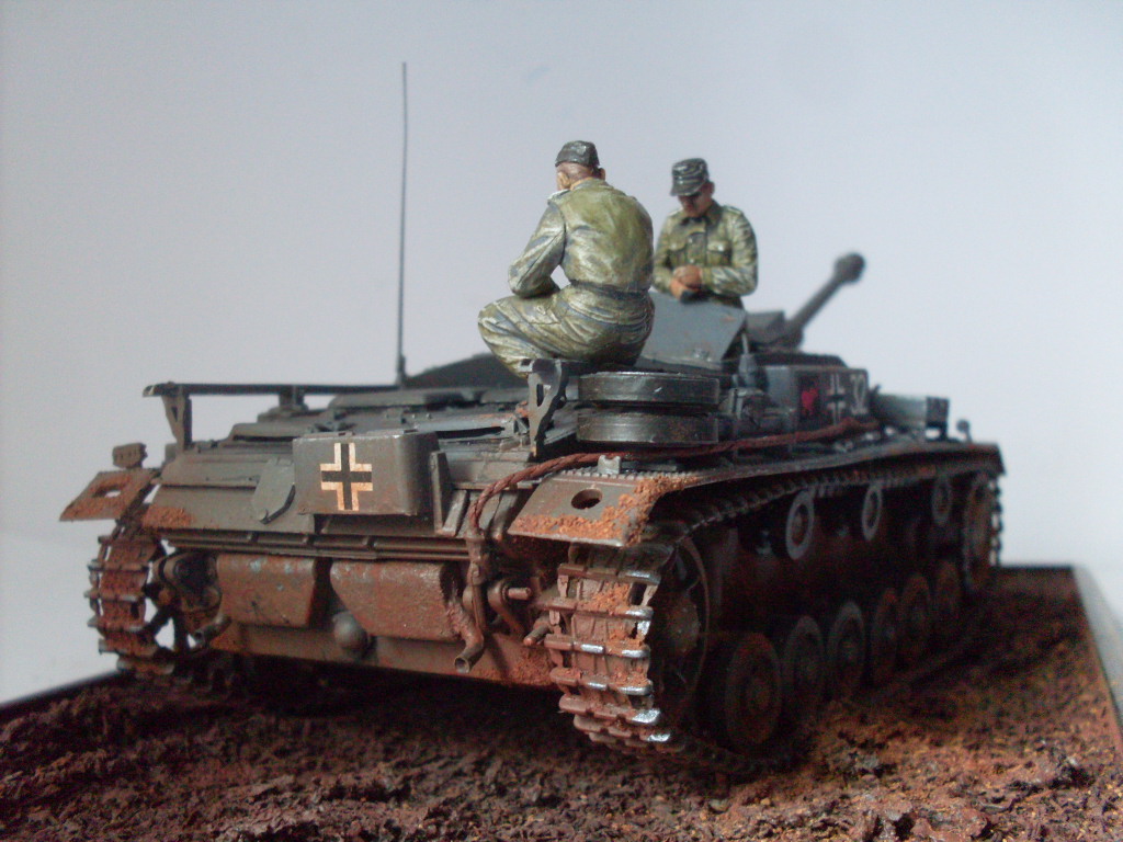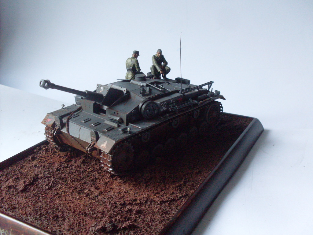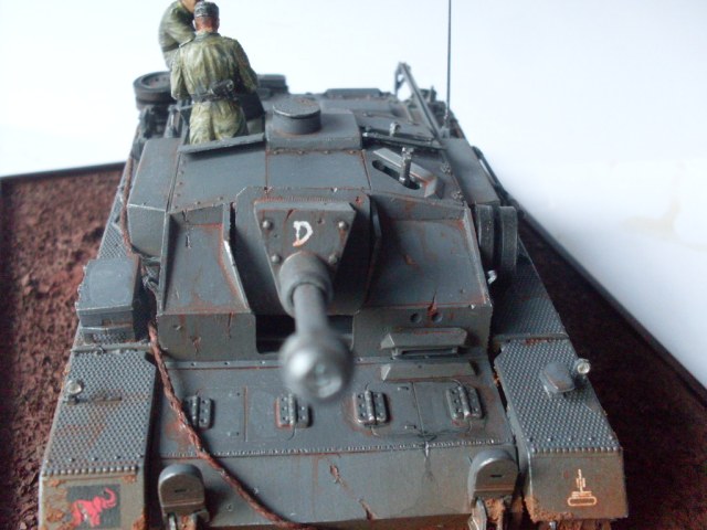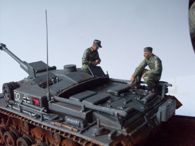 Неплохо, на мой взгляд, сделанная модель! Только цвет грязи и ржавчины сливается (кофейный), если сделать смывку и заржавить глушаки, то машина будет смотреться еще лучше. Судя по следам на броне, "штуг" уже был в боях, а вот сколов краски на машине не наблюдается. Сколы можно сделать той же "Звездой" № 38 (темно-коричневый). Вопросов по матчасти не касаюсь, так как сборка "из коробки". А вот фигурки, по-моему, получились здорово и позы смотрятся, довольно, естественно.
