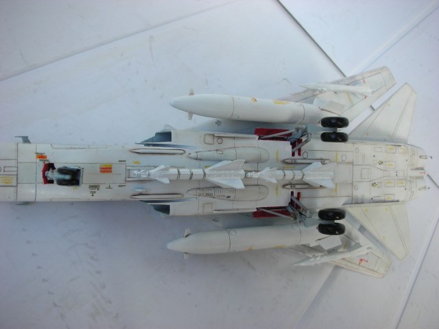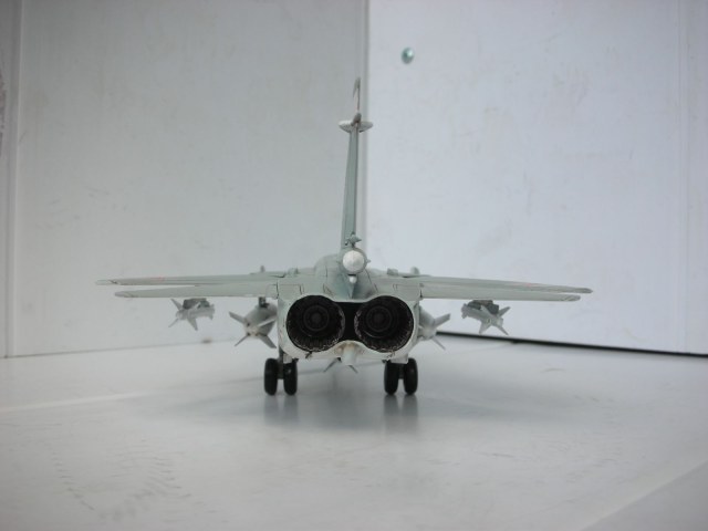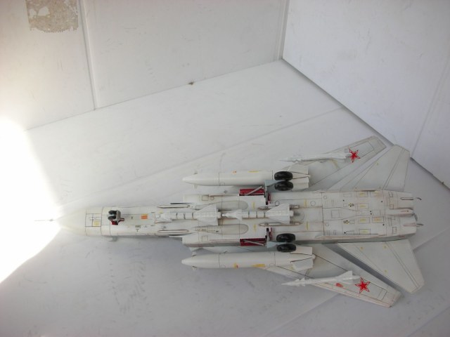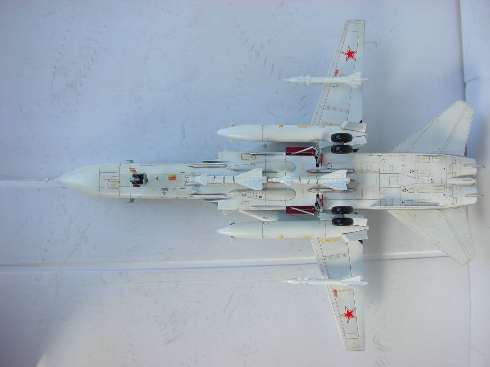 Так-же можно было-бы маленько приглушить техничку и кстати, техничка наклеена от балды, половины технических надписей, которые Вы налепили на модель, нет на прототипе. Красные крестики, как на Миг-29, должны отсутствовать как класс, на баках, за исключением пары надписей, к примеру Т6М-6150-3000л и иногда бортового номера самолета, с указанием левый, или правый бак, нет вообще никакой технички.